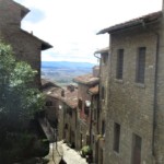 車で行っても、電車で行っても、下から見えるとこんな感じのコルトーナの旧市街。バスターミナルが到着する旧市街の入り口・ガリバルディ広場に着いて、すぐに分かる目抜き通りを行くと、おなじみのあの場所が見えてきます。