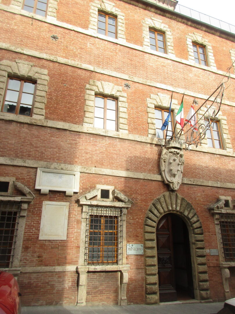 そこからすぐ先、右側に並ぶのは16世紀建設のドゥオモに、13世紀建設のポデスタ宮。ポデスタ宮の外側にはこの地を治めた執政長官の家紋が並び、現在は考古学博物館が入っています。