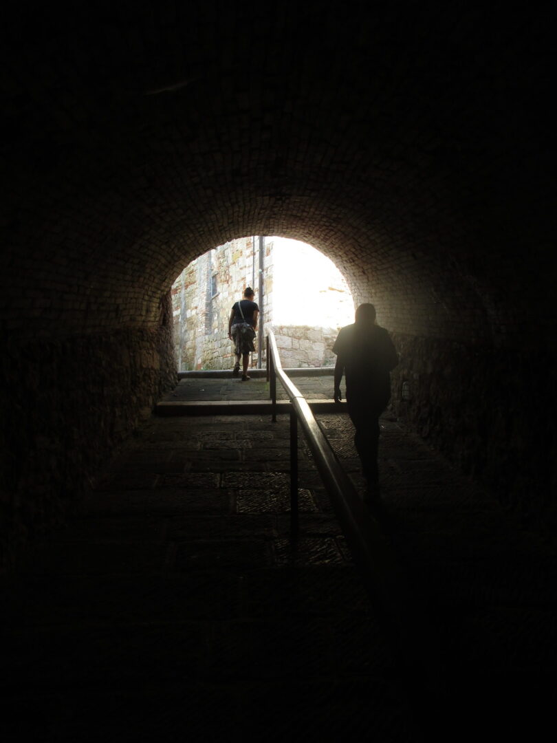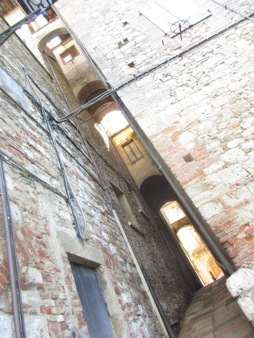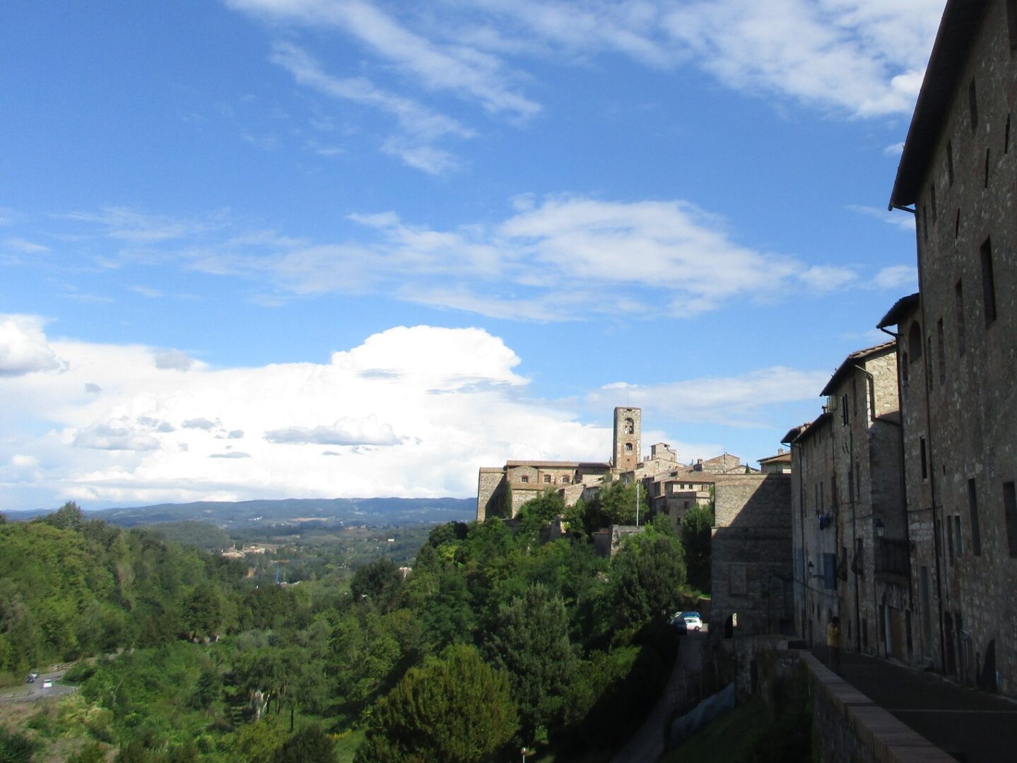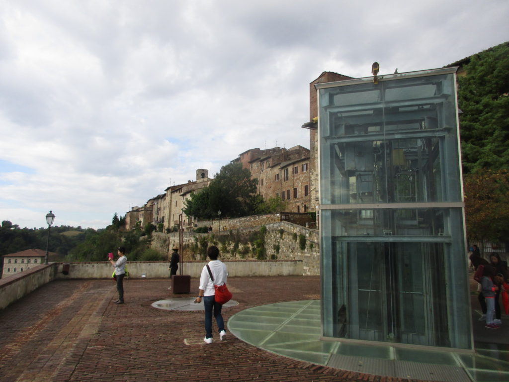 エレベーターは、ちょうど旧市街の城塞の堡塁に当たる所で、ここから新市街の様子もよく見ることができます。上りはキツイですが、帰りはここから出ている道を下って新市街に戻るのもいいですよ。この村はフランチジェ―ナ街道を通っており、サン・ジミニャーノなど他のエルザ渓谷の村と同様、中世から繁栄していたそうです。