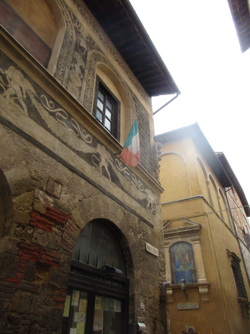 そこから東西に長く伸びる旧市街を、カステッロ通りから東に向かって歩いて行きましょう。エレベーターから半分くらいまでは、ドゥオモやツーリストインフォメーションもある旧市街の中でも古い建物が残っている部分。写真は13世紀のプリオーリ宮。数々の修復の後、現在はツーリスト・インフォメーションや市民博物館が入っています。