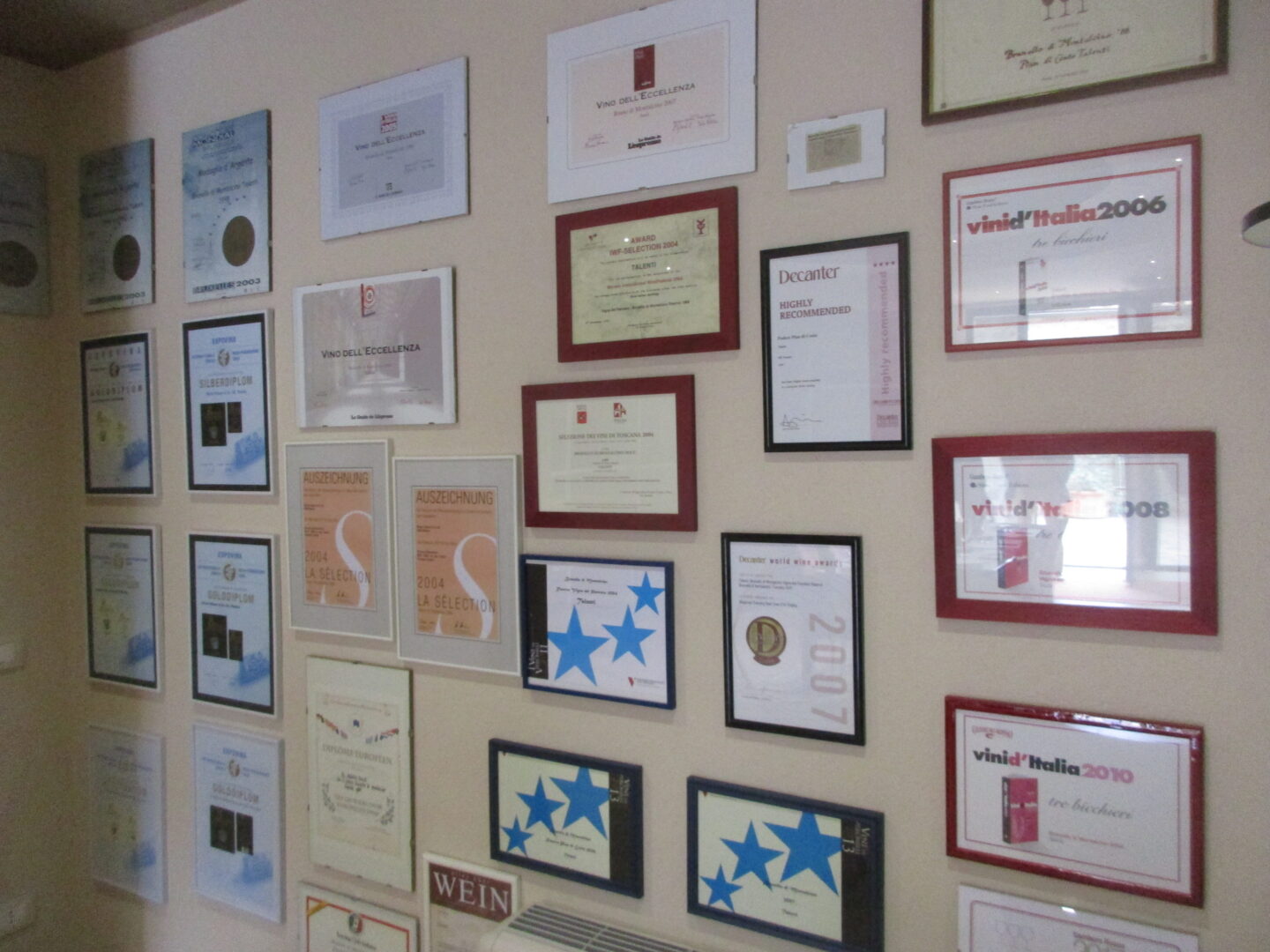 正面には、数々のイベントの参加章だったり、そこで獲得したメダルだったり(有名なワインガイド・ガンベロ・ロッソのトレビッキエーリ=最高評価も近年3回受賞 )大きなブルネッロのボトルがあったり、本のポスターも・・・実はこの本、創業者であるリッカルドのおじいちゃん・ピエルルイージさんの本なんです。