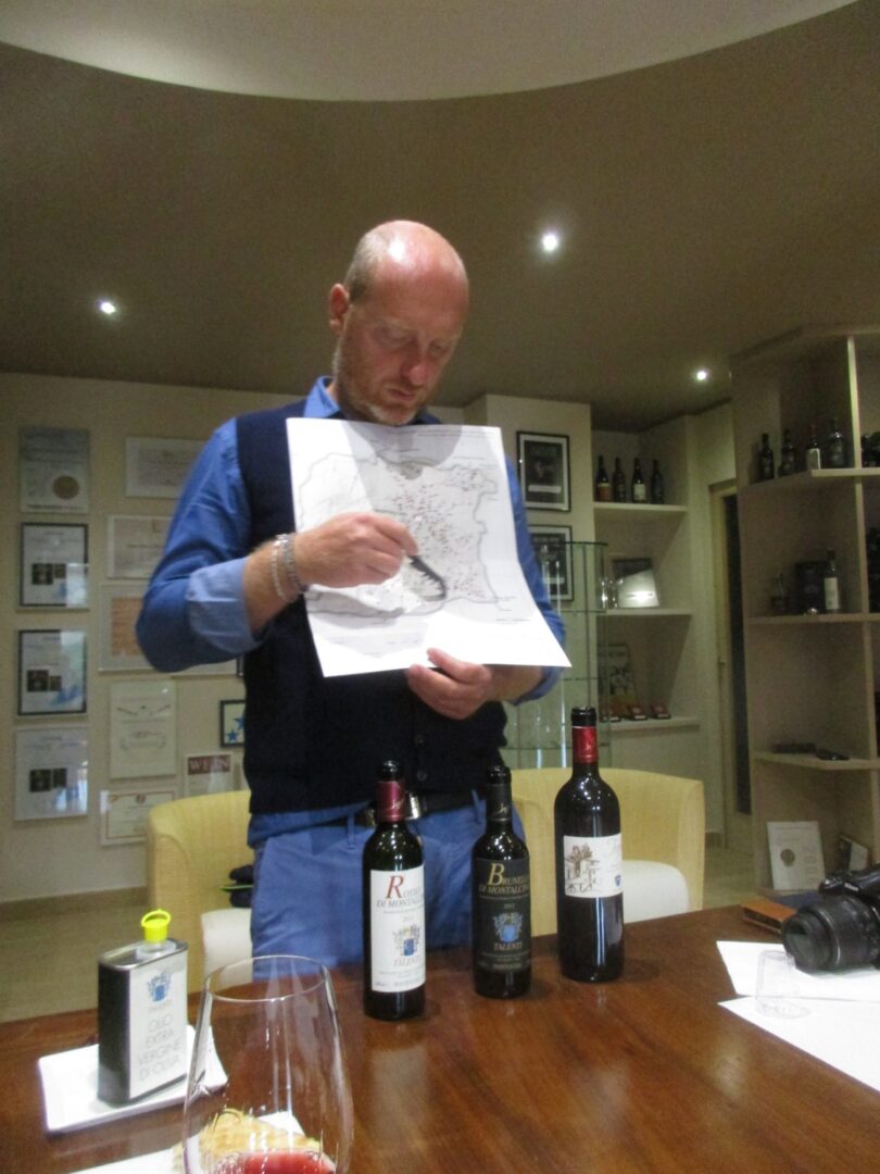 テイスティングルームでは、地図を見ながらモンタルチーノの、そしてその中でも地区によって気候や土壌が違うことなど、ワインができる最初の段階から詳しく説明してくれます。それから、ワイナリーが生産する銘柄の違い、製法に続きます。テイスティングは ロッソディモンタルチーノとブルネッロをベースとして、売り切れてなければ、リセルヴァやIGTも!