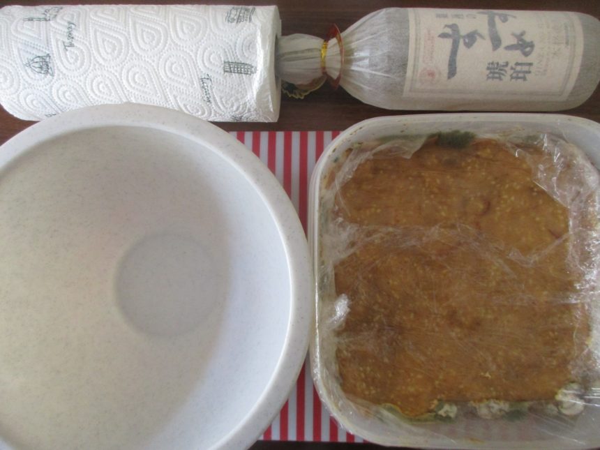 この時に手についた味噌をなめてみましたが・・・食感はマイルドというか、もったりとした感じ。色は少し濃くなったかな?そして、意外と塩が効いている!そのままキュウリを突っ込んで食べてみたい衝動もあったのですが、他にやることもあったのでさっさと先に進みます=3=3=3