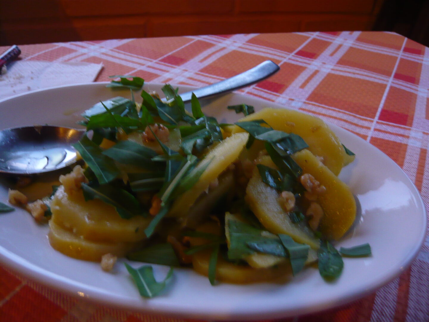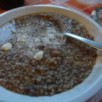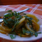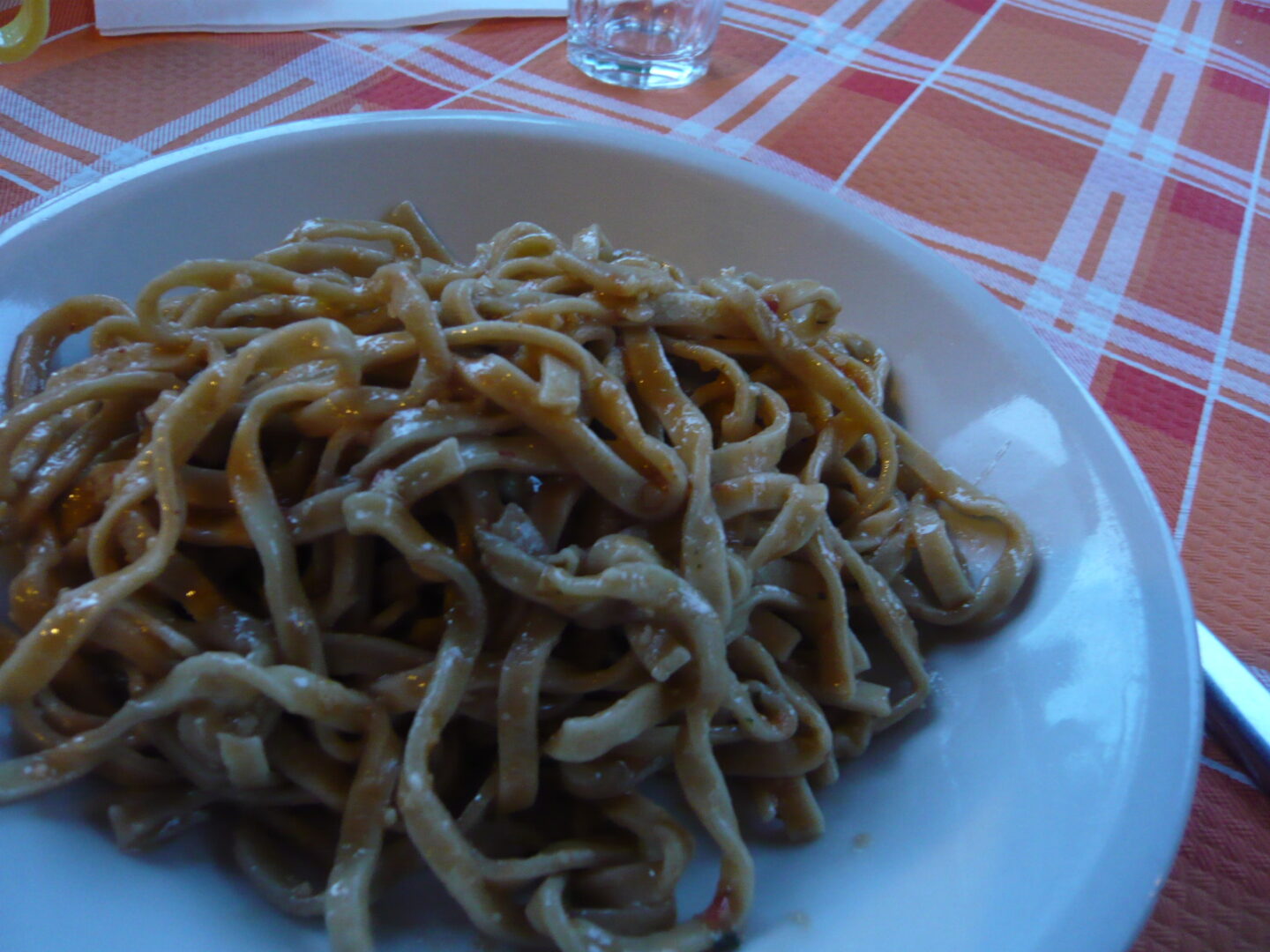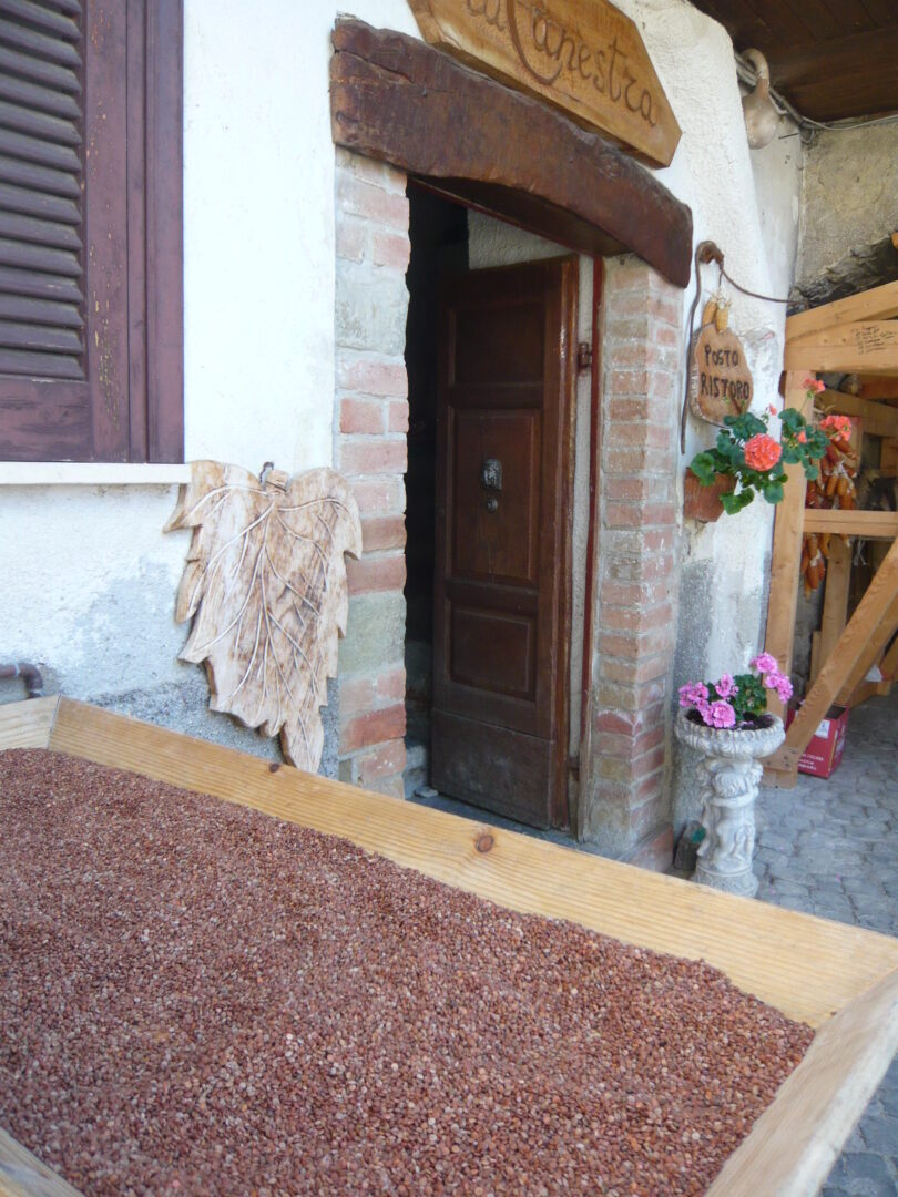 とにかく美味しかったのがご飯。ほとんどが奥さんの手作りで、朝食のリコッタチーズや特産のビスコッティ 「Orme di lupo =狼の足跡」 があまりに美味しくて、毎朝食べ過ぎになるほど。ビスコッティや手打ちパスタは、この地の小麦粉「ソリーナ」を使用したものだそうです。観光から帰って一息つき、その日の最後の楽しみだった夕食も、アブルッツォ名物のアッロスティチ―二(羊の串焼き)だったり、採れたての野菜だったり、シンプルなものばかりなんだけど、どのメニューも「うぉっ!」と感動するものばかり。
