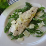 この写真を撮り終わったら、左上のクロスティーニと真ん中の揚げ物がすでになくなっていました(苦笑)。揚げ物の中身は魚系って意外定かではありませんが、クロスティーニはサーモンパテだったそう。クロスティーニから時計回りに、タコと野菜のマリネ、イカと野菜のマリネ、アンチョビ入りパンツァネッラ、コレ―ゴネのカルパッチョ、ラッテリーニのフライ、(おそらく)コレ―ゴネのボイル&海藻?ソース。コレ―ゴネはホワイトフィッシュの一種、ラッテリーニは日本語名不明ですがこんなん、どちらもボルセーナ湖で採れる淡水魚です。コレ―ゴネのカルパッチョは生でなくマリネされていて、パルミジャーのチーズととっても合い、超美味でした!
