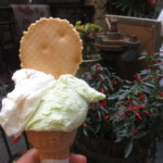 この右のうすい緑色の、なんとバジルのジェラートです。これを選んだら「うちのオリジナルだよ」ってお兄ちゃんが喜んでくれました。バジル嫌い、緑黄色野菜が嫌いな人は絶対ダメですがほのかな甘みの中にバジルがしっかり感じられる、とっても上品な味。次行く時も、私はもう1回食べたいなーと思ったので、皆さんもチャレンジしてみて下さい!