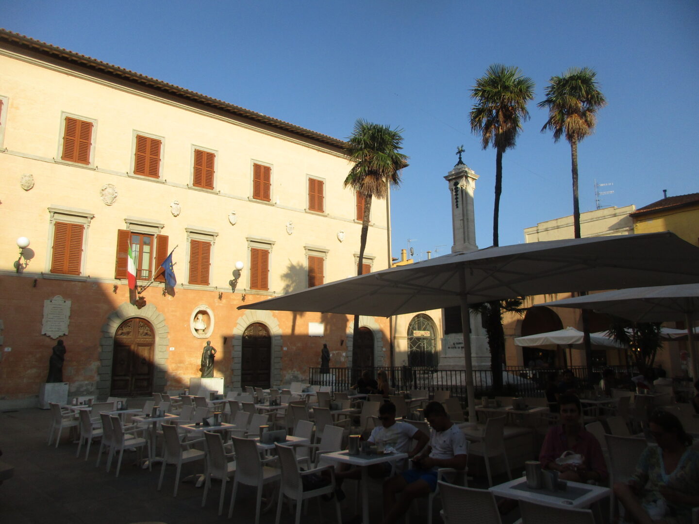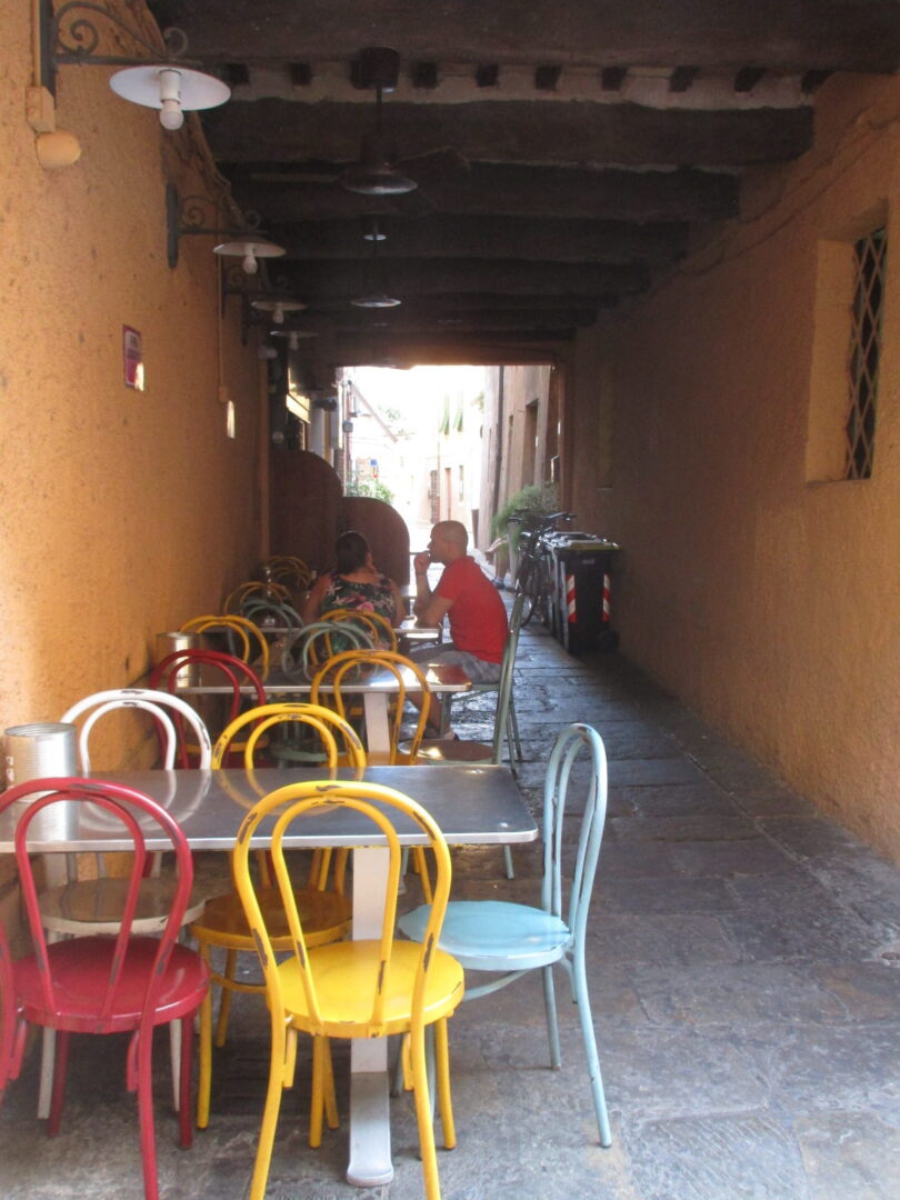 中心になる広場にあるのはポデスタ宮。爽やかな黄色で可愛らしい建物ですが、17世紀のスペイン統治時代に総督が住んでいた建物だったそうです。広場にはカフェのテーブルがいっぱい出ていています。