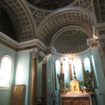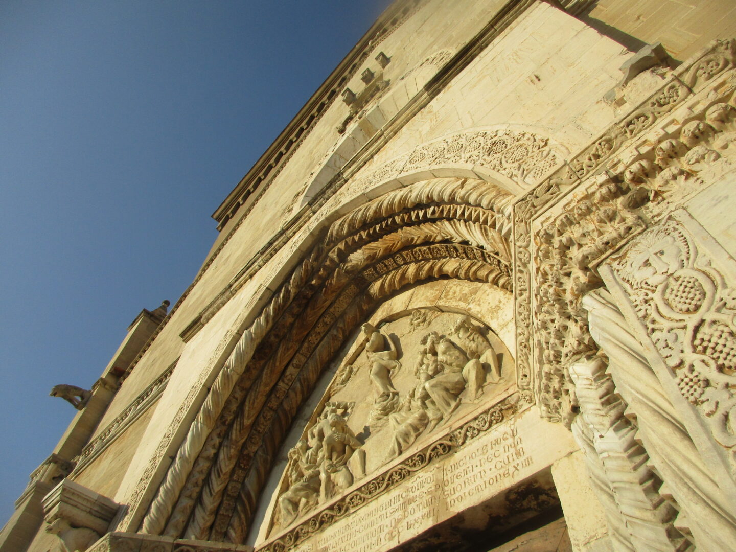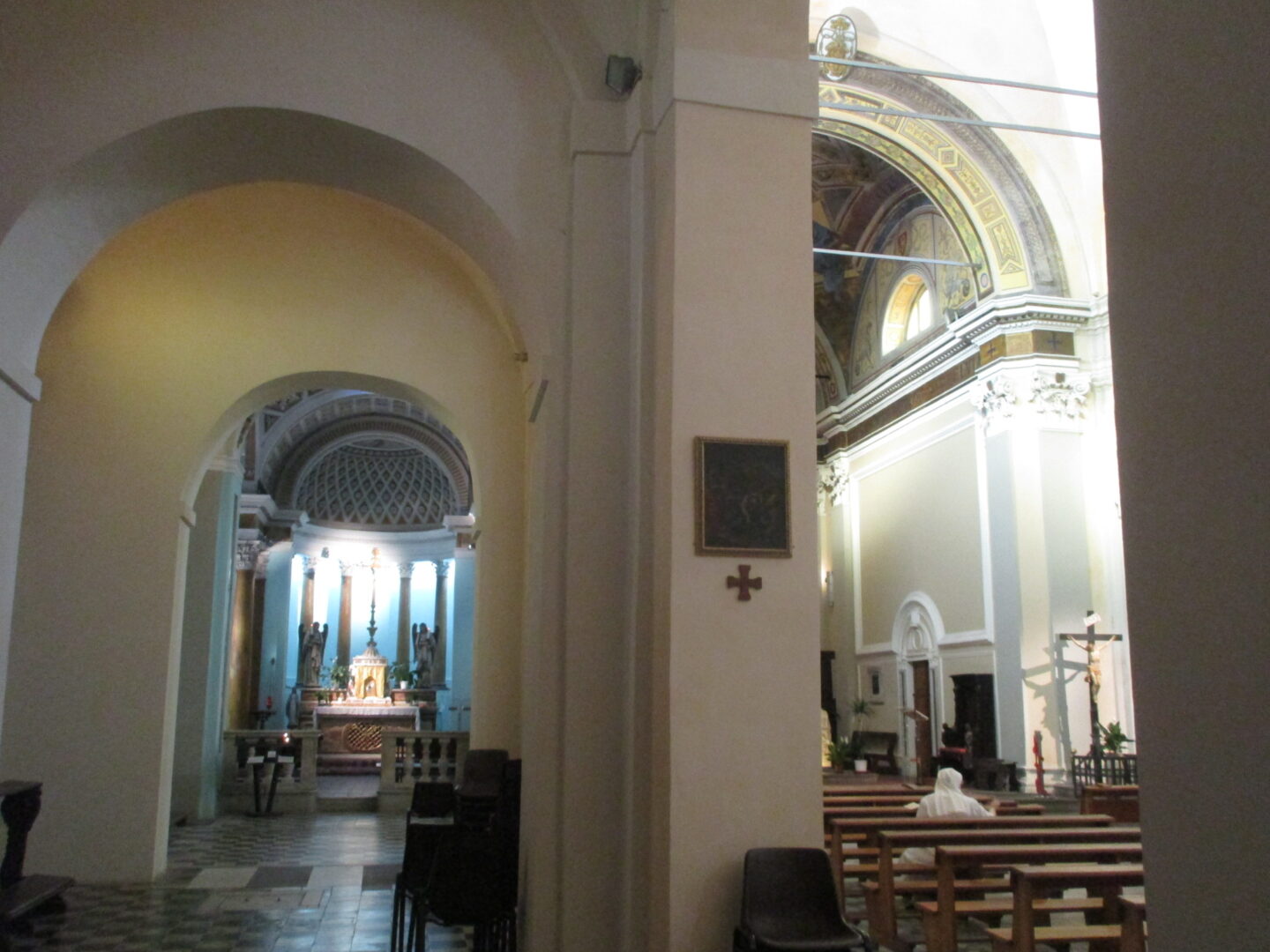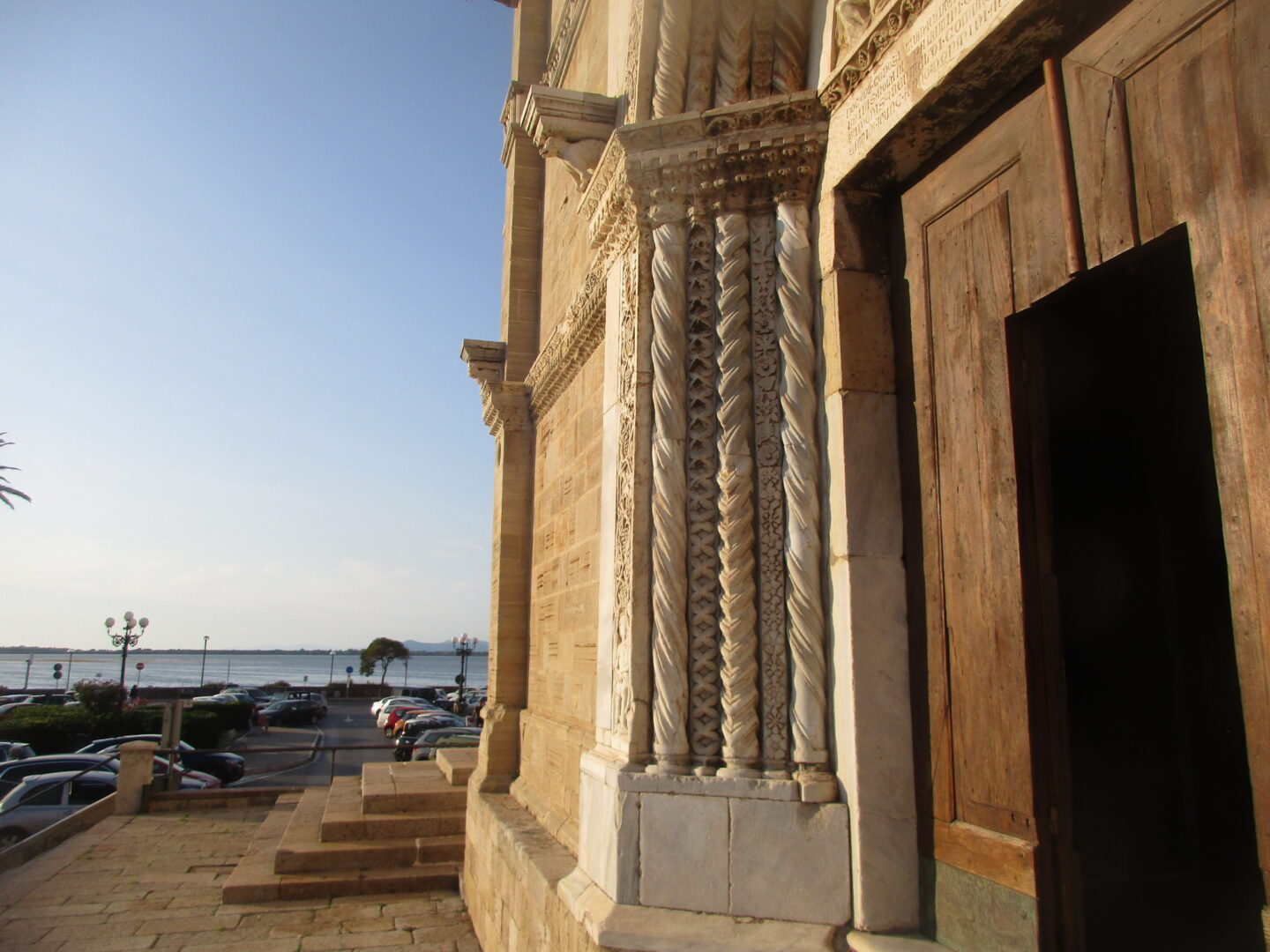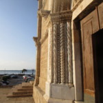 一方、こちらは旧市街の西の端に近い所にある、町のドゥオモ、サンタ・マリア・アッスンタ教会。市役所広場からはほんの数分ですが、観光客よりも地元民の方が多く、穏やかな空気が流れています。教会の歴史は古く、元々は5世紀に建てられたローマ時代の教会の遺構に建てられた教会で、13世紀以降に拡張と装飾が加えられ、現在に至ります。ファサートはバラ窓と精巧な彫刻で飾られ、一方、中は海を彷彿させる白と水色の色調になっています。