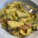 私が訪れた時、美しく広げられたパスタがお迎えしてくれました。せっかくクミコが来てくれるから、朝から作ったんだよ~と準備してくれていたのはマルタリアーティ。マルタリアーティはパスタ生地をぱぱっと適当に切ったものなので、普通は同じ形をしていないのですが、「僕が切るとつい同じ形になっちゃうんだよ」とジャンルーカ。電話やメール交換をしていてもにじみ出ていた、ジャンルーカの几帳面な性格がパスタにもそのまま出ていて面白い!