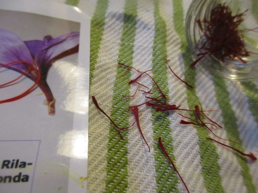 小市民な家庭なもので(?)、サフランは粉しか知りませんでした。サフラン自体が何かもはっきり言って良く分かってなかったし、どんな価値があるものかさえも・・・今回、通訳でサフラン農家を訪問する機会があり、サフランのことを教えて頂きました。サフランは11月に年に1度だけ咲くアヤメ系の花。ギリシャ原産でヨーロッパ、中東を中心に栽培されていますが、食用の乾燥させためしべを1g作るのになんと花が200個近く必要なので、とても高価なのです。しかも、全部、手作業!!訪問したのは8月末で、ちょうど球根を準備しているところ。この農家はオーガニック栽培で、食用サフランを作っているほか、他のサフラン農家に球根を販売しています。そして訪問が終わった後、昨年に採れた貴重なサフランを頂いてしまいました~使い方さえ知らないので、使い方の用紙ももらって(笑)。