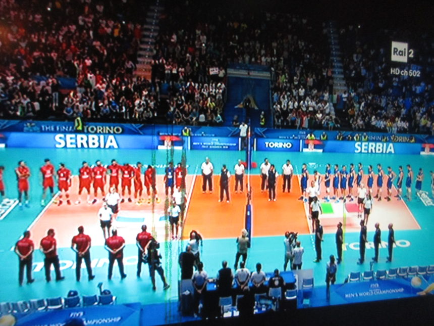そして昨晩はファイナル6。予選2ステージを勝ち上がった6チーム、イタリア・セルビア・ポーランド、ロシア・ブラジル・USAのうち、2チームづつが勝ち上がり、準決勝、決勝が続きます。一次予選はフィンツェ、2次予選はミラノ、そしてファイナルからトリノ!第一試合はセルビア!解説は、もちろんこの人、ルッケッタ!
