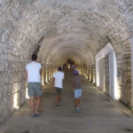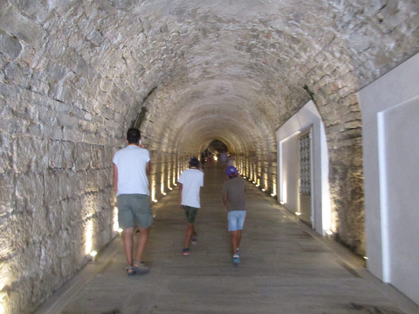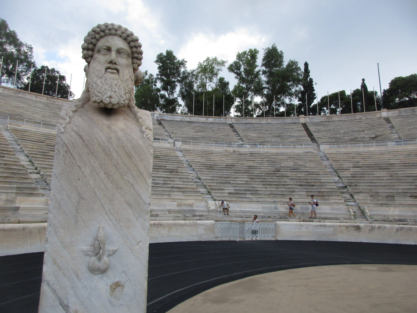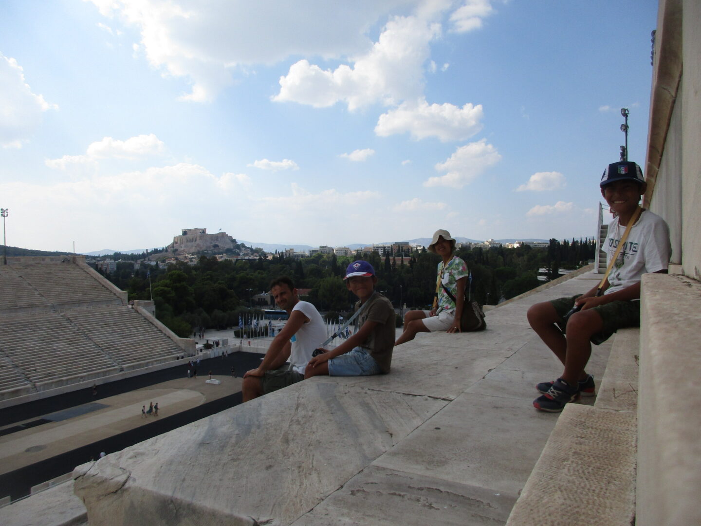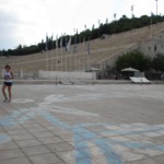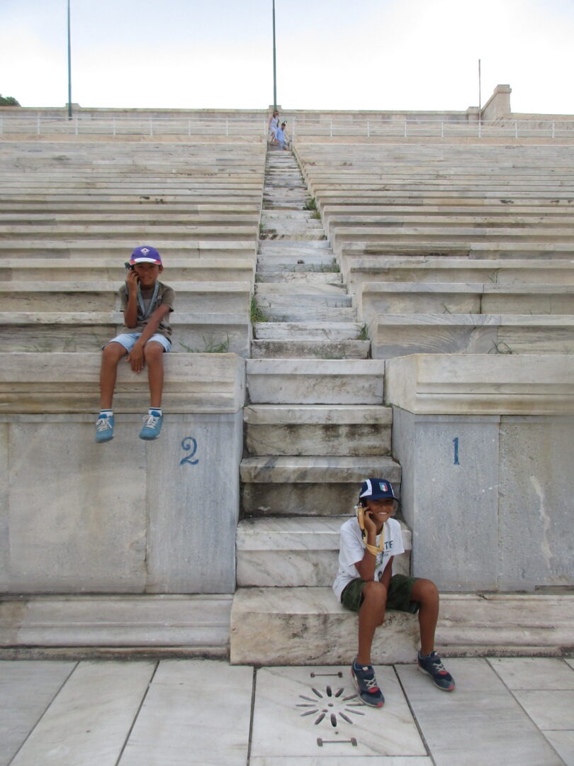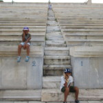 これは観覧席から見た全景ですが、現代の競技場とはなんか違いますよね?そう、極端に長細いのです。古代の競技場をそのままに、トラック1周が330mの馬蹄型になっています。直線はいいけど、カーブがほぼヘアピンに近いので走る人は大変!・・・てことで、何故か走る息子たち。ま、そうそうこんな所で走れる機会はないですから、正しいってことにしときましょう。