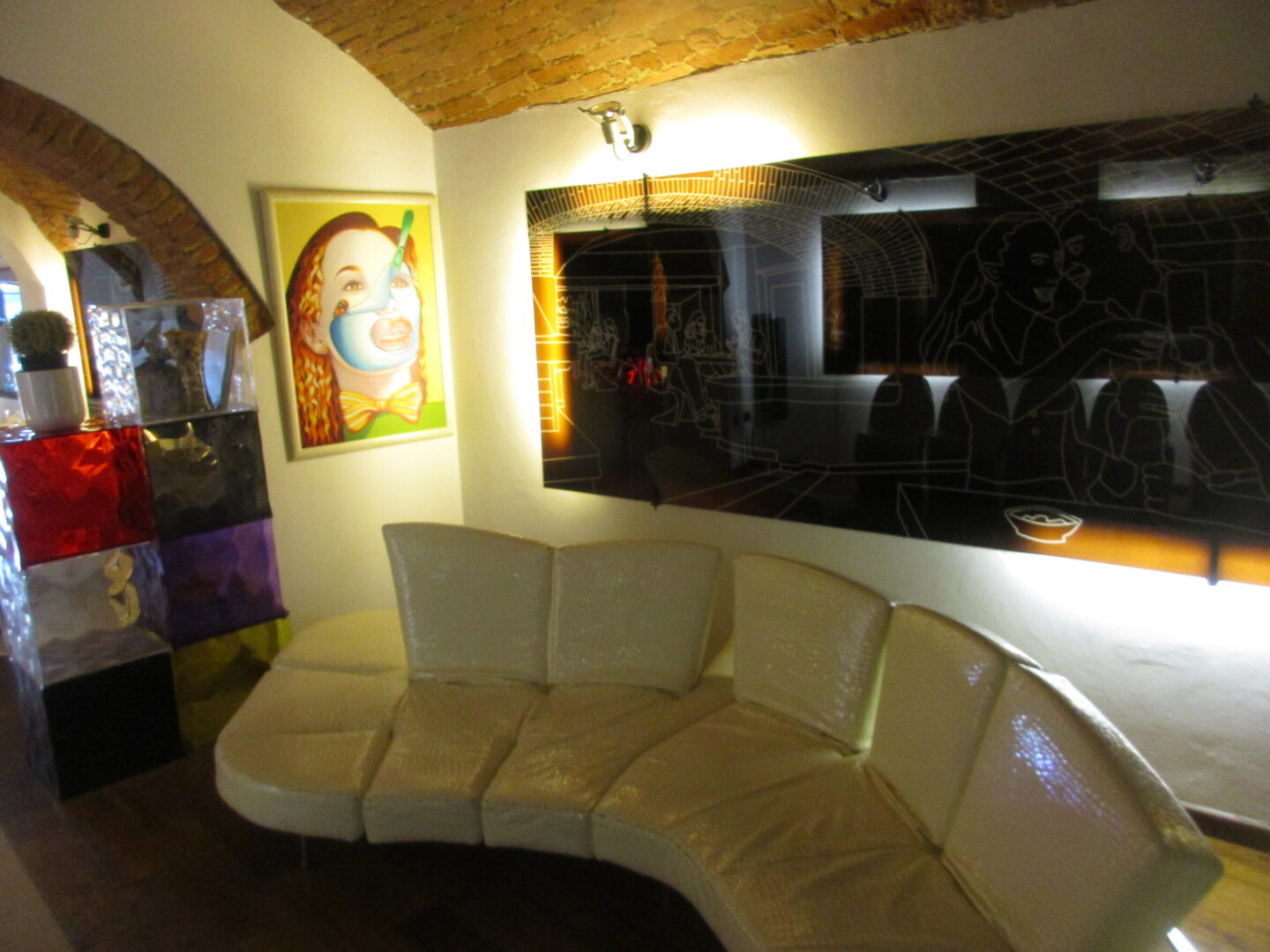 入口から長いホール、白と茶色を基調にした内装にカラフルなコップがとてもオシャレ。人々が描かれた大きなパネルが両壁を飾ります。
