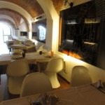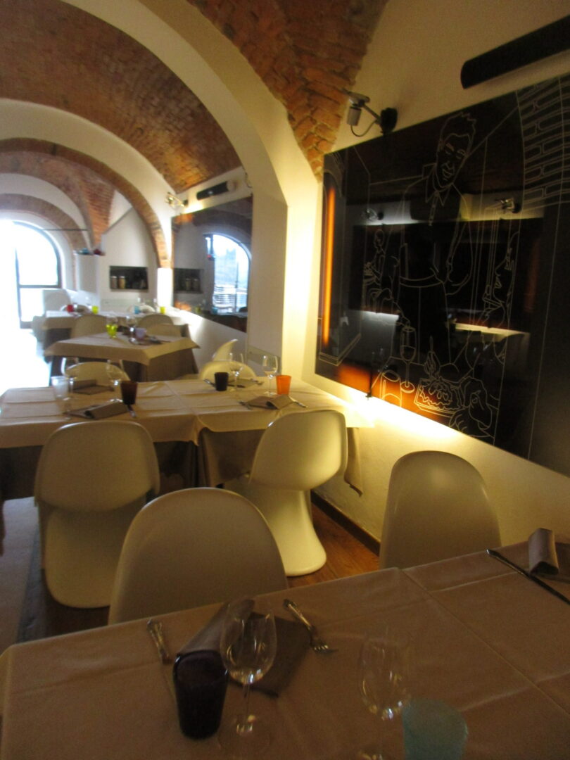ピサ県のサン・ミニアートと言えば、ピエモンテ州・アルバに並ぶ、トリュフの産地!そして年中採れるトリュフの中でも、秋に採れる白トリュフ・プレジャートが有名ですね。まさに秋、お客様のご要望でサン・ミニアートの名店「Pepenero(ペペネーロー=黒コショウ)」に行く機会に恵まれました。予約のメールも、素早く丁寧な返信。サイトで見る写真にも、どれもうっとり・・・それが着いてみると、普通の通りにドア1つのとっても簡素な店構えでした。しかし、階段を少し下って中に入っていくと、古い町並みとは対照的な、モダンでアートな空間が広がっていました。