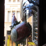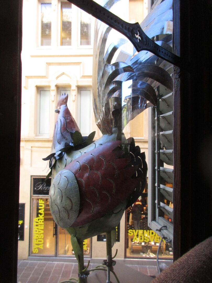 私たちはレストラン入口からまっすぐ入ったホールに通されましたが、なんと、窓際の半円にベンチがついた席~なんだか優雅な気分ですわよ♪ この写真では見えにくいですが、ここの窓にも鶏とクジャクのオブジェがありました。
