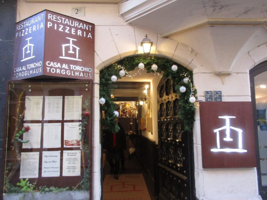 トレンティーノ・アルトアディジェ州の町、ボルツァーノ。州内で最北端の県の県庁所在地で、クリスマス・マーケットが有名です(1日バスツアーなども出ているほど)。スキー旅行中に日帰りで給に行くことになったので、レストランの下調べはしなかったのですが、散策していた時に偶然に見つけたレストランが当たりでした~地図で見ても、ほんと旧市街のほぼど真ん中、お店が並ぶ道の交差角っこにあります。白い建物に、大きく書かれた店の名前と、窓に置かれた金属の動物オブジェが目印~これが可愛い♥ イタリア国境沿いの町にありがちですが、ここもイタリア語とドイツ語併記、そう Torgglhaus というのがドイツ語での名前なんですね。ちなみに Torchio というのはTOP写真の看板の絵にもあるように、ブドウの果汁などの為の圧搾機のこと。自家製ワインなどを作っている田舎の家には、絵のような木製圧搾機がよくあるんですよ。