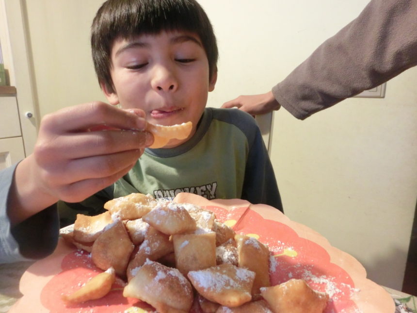 イタリアのカーニヴァル時期、各地でその地ならではのお菓子がたくさん出回ります。トスカーナでは、すでに紹介したスキアッチャータ・アッラ・フィオレンティーナ、お米のフリッテッレ、そして今回ご紹介するチェンチ。しかしこのチェンチ、ほぼ同じものがガラーニ、キャッケレ、ブジーエ、などと各地で呼び方が変わるのが面白い!ちなみにチェンチはその形から「端切れ、雑巾」の意味があります。同じトスカーナでもレシピがいろいろあり、バターや砂糖を入れるものもありましたが、我が家のばーちゃんから伝わるレシピはバターの代わりにオリーブオイル、生地に砂糖は入れない、その代わり少しドライイーストが入るので、端切れというよりもクッションみたい。さくっと軽い仕上がりになっています。