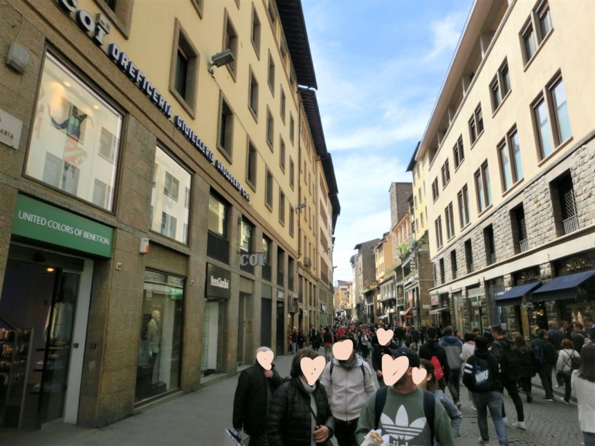 フィレンツェのポール・サンタ・マリア通りは、猪増のあるポルチェッリーノ広場からヴェッキオ橋へのびる通り。