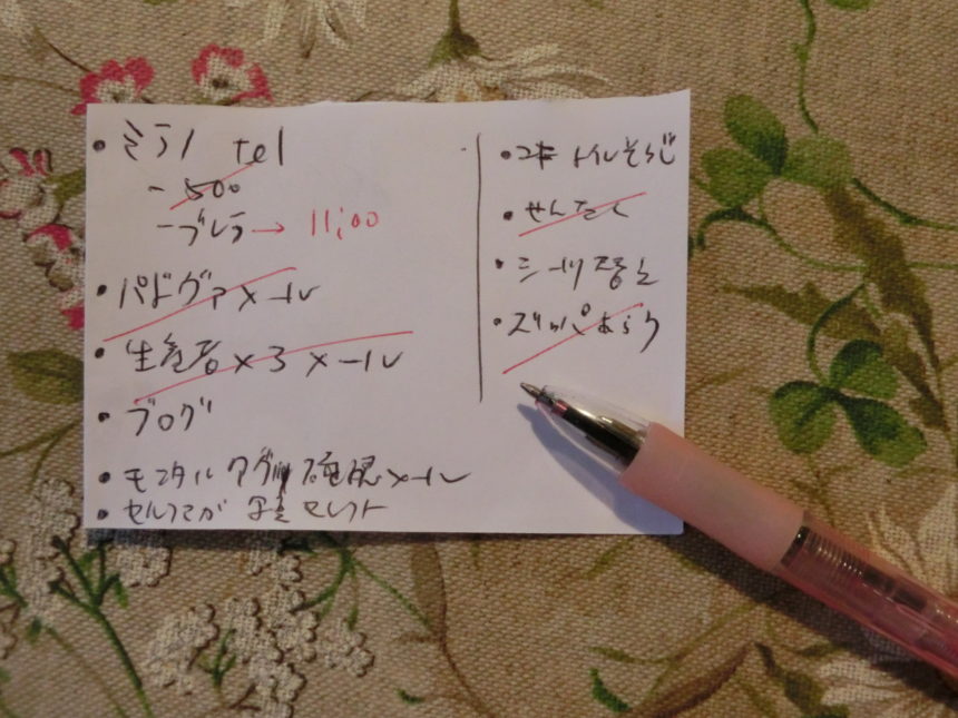 忙しいとそれさえやってるヒマないわ!という方もいらっしゃるかもしれませんが、人間は(少なくとも私は)やることが多いと忘れます。やってるうちに忘れます(爆)。たった5分、頭を整理して書くだけで、効果てきめん!これは、きっちり納期がある仕事ばかりしていた日本の会社員時代に毎日やっていたこと、最近また始めて見ました。そして、これも人間の自然な欲望として、今日やるべきこととリストアップして目に見えてしまうと、さっさとやってクリアしてしまいたくなるのです・・・これが頭の中にぼんやりあるだけだと、忘れるか、先延ばしになってしまいます。できなかった項目は、翌朝のリストの上に書きましょう~絶対やるべきこと、できればやるべきこと、時間が余ればやること、くらいに分けて書くとなお良し。私の場合は、仕事系と家事系を分けて、隙間時間に家事を組み合わせる感じでしょうか。