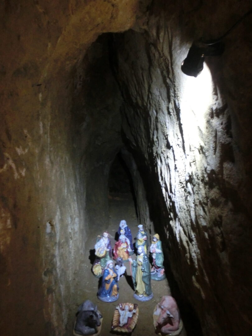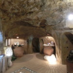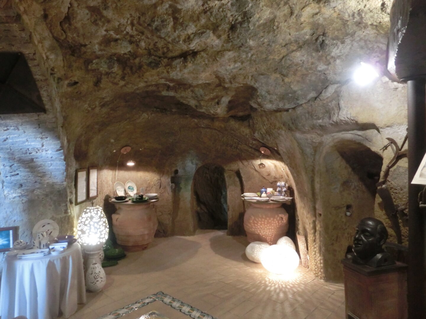 なんと、かつて凝灰岩を掘って作られた空間は古の井戸、そして中世以降はピッコロ―ミニ家から直通する秘密の地下道があった場所。その後、オリーブオイルの搾油所となったのですが、その当時の石臼なども見事にインテリアにしてしまっているところがお見事。