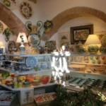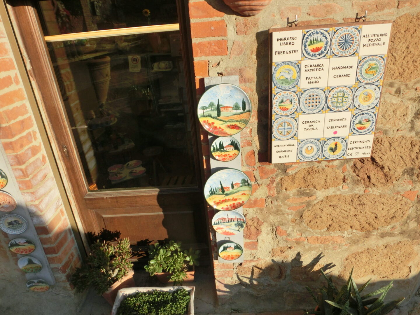 世界遺産・オルチャ渓谷の中でも、やはり一番人気なのが村そのものも世界遺産となっているピエンツァ。ドゥオモなどの見所の他に、小さな旧市街の中にはレストランやお店も充実しているからでしょう。いわゆるお土産屋さんの他に、職人さんの技やアイディアの光る工房も多く、それを訪ね歩くのも1つの楽しみ。それを教えてくれたのが、この陶芸工房のリンダさんです。今までも幾度も前を通り、中にも数回入ったことはあるのですが、先日、店の奥まで入って中をよく見たり、オーナーご夫婦ともお話しすることができました。