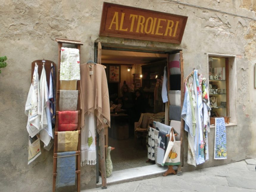 オルチャ渓谷のピエンツァにある布製品の専門店。ムレッロ門から入ったら、そのまままっすぐメインストリートのロッセッリーノ通りを直進して、右側。こんな風にレトロな看板と、布製品もたくさんかけられているので、すぐに分かると思います。最近はアテンドでピエンツァに来ることが多いのですが、お客様みなさん、ここにふらりと入って行かれるんですよ。