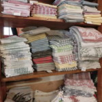 店内左側には、布、布、布の棚!多くはテーブルクロスやテーブルランナー、ふきんですが、そのほとんどが前のテーブルや別籠に展示されていますので、まずはそこをご覧になって、気になる柄やサイズがあればスタッフに他のバリエーションを聞いてみましょう。ここも家族経営のお店で、元々はアンティーク家具の工房。店内にある家具は、弟さんのアンティーク家具店からきているんです。