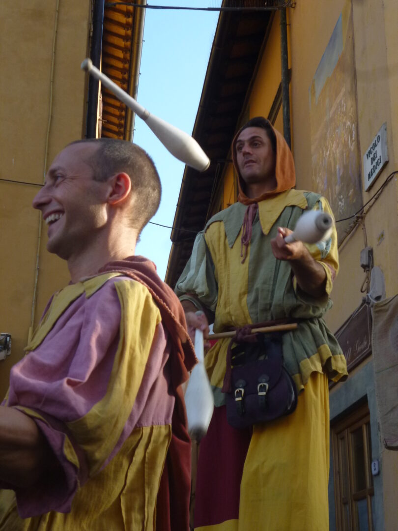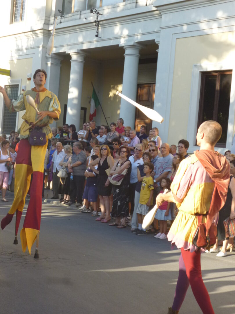お祭りは駅から10分ほど離れた旧市街。中心にあるジョット広場ではいろんな屋台が出たり、大道芸人のショーが繰り広げられています。そこから更に大きいヴィットーリア広場に移動中、ここにも道を阻む大道芸人がおり、子供も大人もキャッキャと喜び芸人とのやりとりを楽しむ場面も。外国人観光客はほとんど(いや皆無?)おらず、地元や近郊の家族連れでにぎわう雰囲気も楽しいですよ。