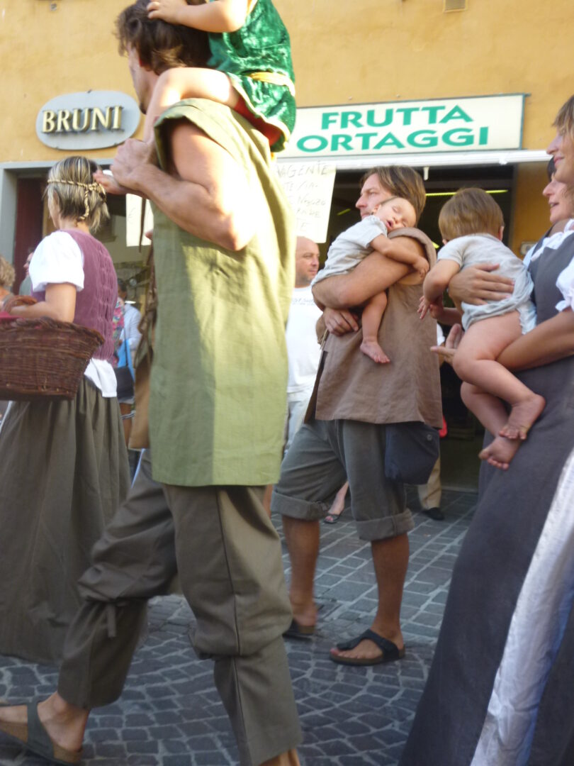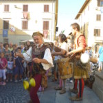 パレードが終わった後、イタリアのお祭りでは定番の旗のショーがちょうど始まったところ。バンドの演奏の後は、大人4人のショー、それから少年2人のショー(まだ上手じゃないので、見ている人も親の気持ちでハラハラしながら見てしまいます)、それから大人のワンマンショー、見事に2本の旗を使ってのショーは素晴らしいです。最後は大人8人のショーがあり、パレードをした皆で挨拶、で終了!だったのですが、この挨拶の時に人ごみから2人の子供が駆け寄って・・・この子たちのお父さんはショーの騎手で、きっとお父さんのスゴイ所を見て感動しんでしょうね。