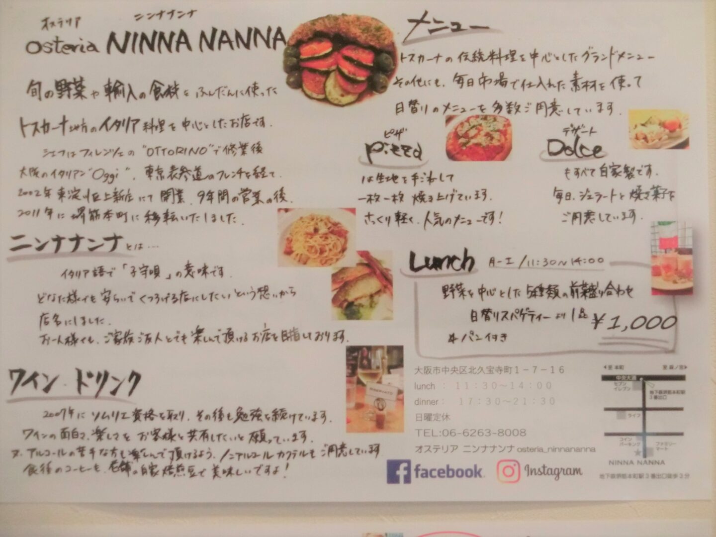 大阪のオフィス街、堺筋本町にはためくイタリアの旗が目印の、ニンナナンナさんです。お店の名前、ニンナナンナはイタリア語で「子守歌」という意味。1人でもカップルでも家族でも、誰でもくつろいでほしいというオーナーの願いからつけられた名前です。実際、店構えもとてもナチュラルで入りやすい!右側はガラスブロックになっていて、狭いながらも明るく居心地が良い空間になっています。