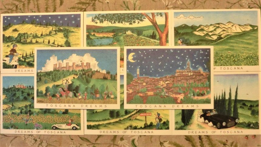 春にお客様のアテンドで行った、シエナの旧市街で偶然見つけた素敵なもの。それがこの絵葉書たち。帰省時のイベントでセルフマガジンにつける葉書にしようと、その場にあった全てのデザインを1枚づつ買って帰ったのだけど、外の写真の葉書と混ぜるとなんだか取り合いになりそうだったので、とりあえず今回は出さずに手元に置いておいたのです。またシエナに行ったら買い足そうと思っているのだけど、ふと見るとサイトのアドレスが・・・こうしてこの素敵なトスカーナの絵を描いた人物を知ることができました。