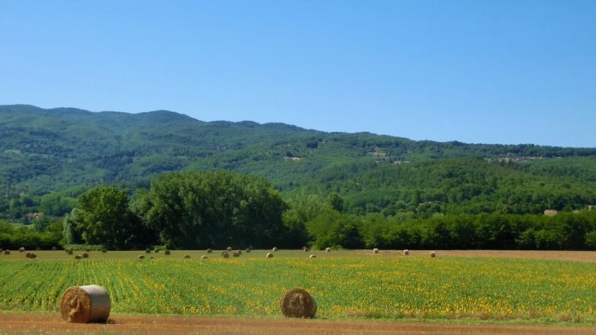 トスカーナの夏の景色といえば、いろいろありますが、この藁ロールもそのうちの1つですね。オルチャ渓谷などに行かなくても、おらが村ゾーンでも、あっちにごろごろ、こっちにごろごろ、どこに行っても転がっています。この日はおらが村から北西へ、車で40分くらいのアウトレットへお買い物。昨年すごいヒマワリ畑があった場所は、やはり今年は更地になっていましたが、その手前のガソリンスタンドの奥に、一面のヒマワリ。私のコンデジではこの程度の写真しか撮れませんが、奥にあった分、手前の藁ロールとの組み合わせはなかなか見られない貴重なものだったかも!
