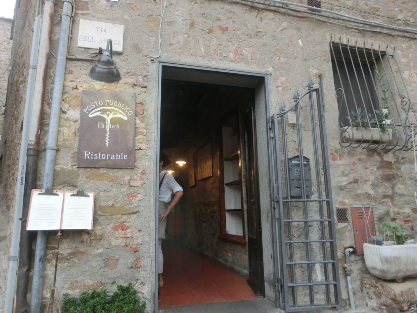 カスティリオーネ・デッラ・ペスカイアの、旧市街にあるレストラン。近郊の海に滞在中、私の誕生日があったので、このエリアに詳しい友人から教えてもらってディナーに行ってきました。誕生日ディナーということで、「ちょっと特別な日のシックなお店」のリクエストに選んでくれたお店がここ、ポスト・プッブリコ。海沿いや新市街にある賑やかな感じでなく、旧市街に3つしかないレストランのうちの1つ。門を抜けてすぐ前にあるお店です。