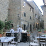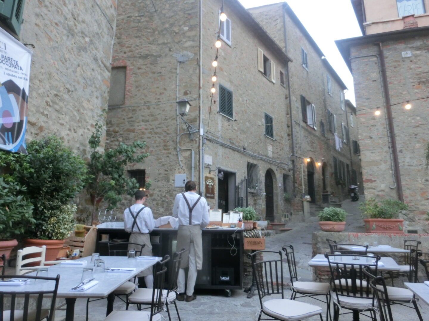 冬はどうなのか分かりませんが、良い季節はお店の斜め前にあるテラスがホール。造り見ると、元民家で(家の部分は現在レストランの倉庫のよう)、玄関前の庭部分を使っています。なので囲いがあり、そこにもクッションをひいてアペリイェィーヴォもしているよう(写真上では、開店前で店のスタッフが休憩しています)