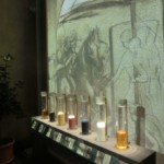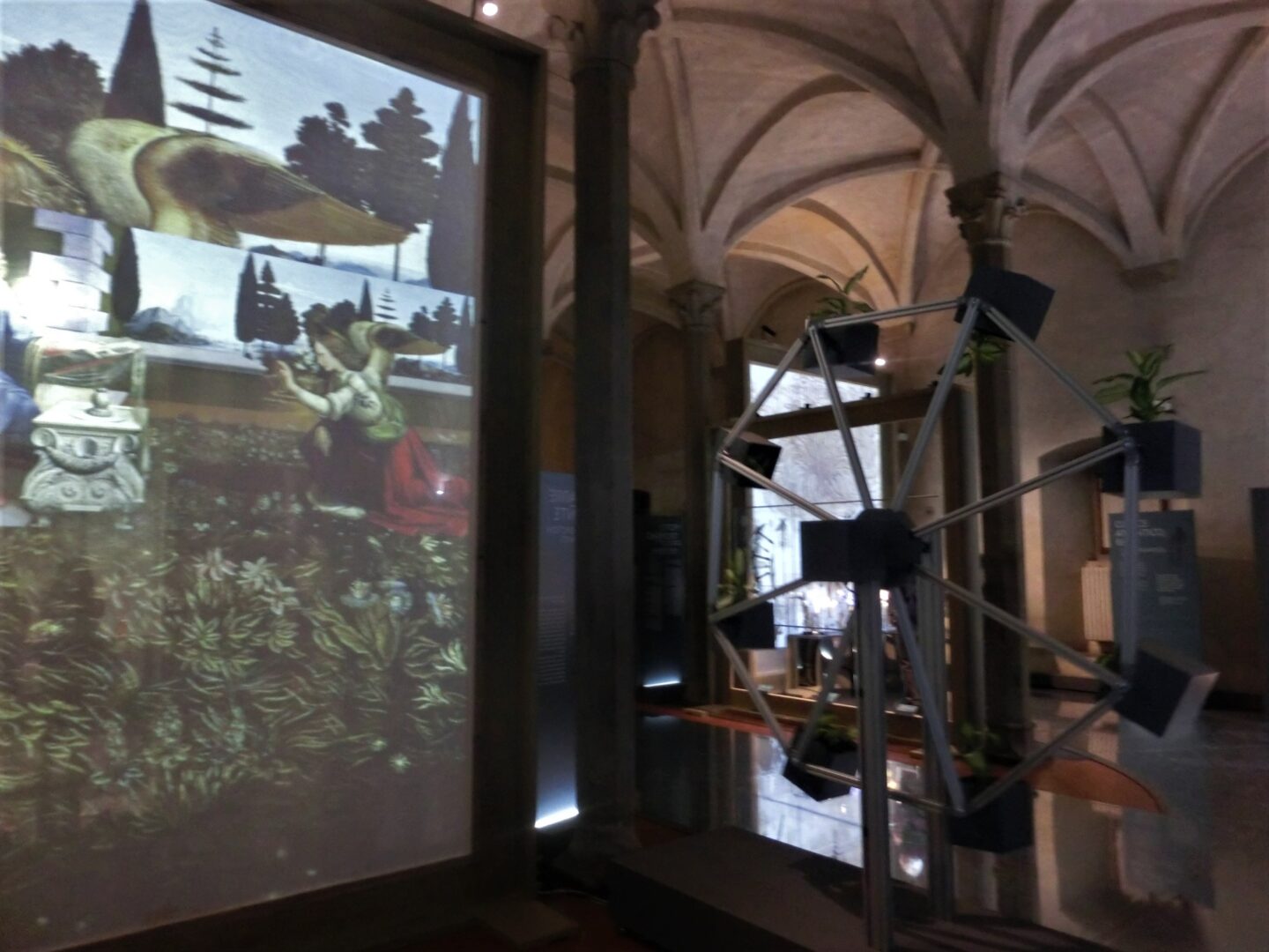 入口は薄暗く、手前天井に浮かび上がるのはミラノ・スフォルツァ城で最近修復が終わった「アッセの間」のフレスコ画(TOP写真)。そこに描かれているのは、桑の木・・・緻密に描かれた木は、まさにレオナルドの自然観察と、そこから考察された地球上の体系学なのです。