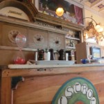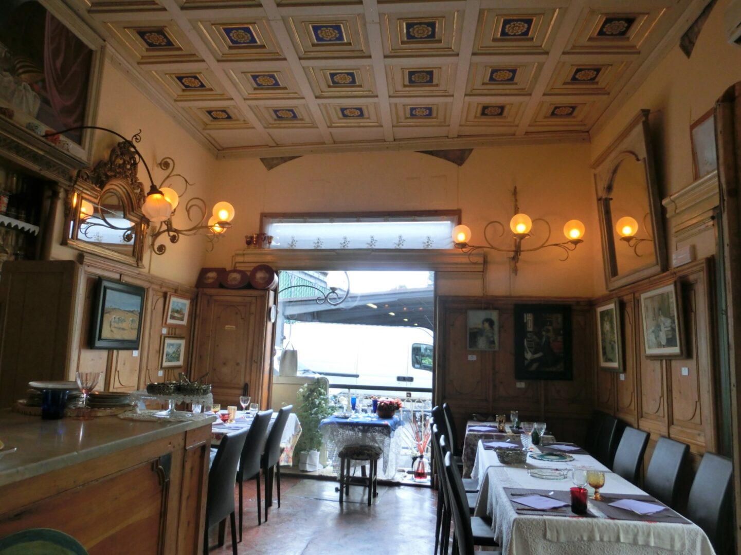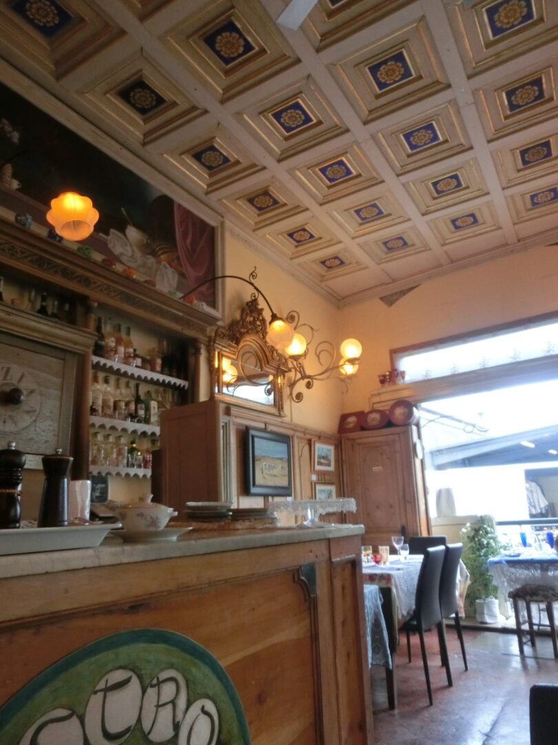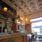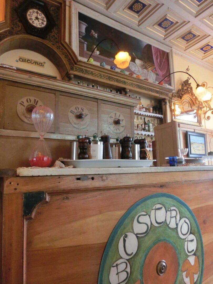 お店は入るや否や、うわぁ!と声を上げたくなるほど洒落ています。それもそのはず、ジルダさんが大好きなイギリス映画「眺めの良い部屋」でも使われたペンションとそのオーナ―・バルトリーナ婦人を再現したもので、なるほど!なんとなくレトロであまりイタリアっぽくない雰囲気なのです。すみずみまで「アールヌーヴォー」にこだわった内装は、1920年のトリノ銀行のカウンター、ヴィラ・ロンバルディの壁付け照明などなど・・・。そして店内では、不定期に絵画などの展示もしています。