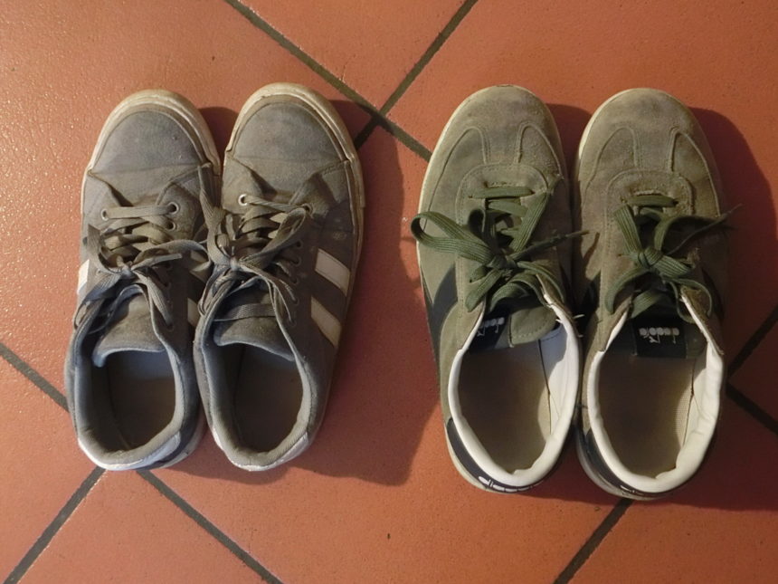 長男からのお下がりは、もちろん3才年下の次男へ。が、今回はオカン(私)がもらいました。何をもらったかって、冬向けのスニーカー。左の私のは使い古して底に穴が開いているので、右の長男の昨年のを拝借することにしたのです。身長もいたって平均で激細の長男ですが、足だけはやたらデカく昨年のでさえも24.5cm(現在25.5㎝)。さすがに生き残った靴はこれだけなので、もうお下がりの靴をもらうことはないだろうけど、こんな日がくるとはな~💦 私は背が高いので身長はまだまだ追い抜かれないとは思うけど・・・とか言って、来年は服のお下がりももらってたりして(笑)