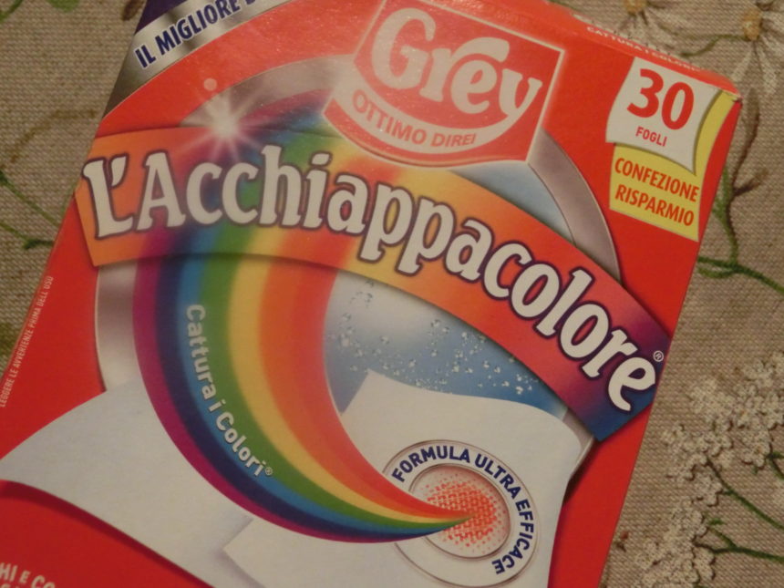 皆さんは洗濯の時、「色もの」と「白もの」を分けて洗っていますか?うちは基本分けていますが、最近は雨の中のサッカー練習で、色ものばかりの濡れた練習着をすぐに洗いたいのに、色ものだけでは洗濯機がいっぱいにならない・・・という時があります。そんな時は白ものの洗濯物を混ぜるのですが、色移りが心配なシャツなどがある時は、この「L’Acchiappacolore」を使えば安心!Acchiappare=つかむ、Colore=色、つまり、色をつかむ=洗濯物から色が出ても、このシートが色を吸い込み、他の洗濯ものに色移りしない、という訳です。