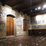以前は広場から階段を上がって入場でしたが、2017年に行った時は裏手から中庭を抜け、中庭から階段を上って入場でした。フレスコ画、家紋などで埋め尽くされた壁面も圧巻で、中世にタイムスリップしたような気持ちになります。階段の上にチケット売り場がありますが、以前は絵画館&塔だけだったチケットは、現在は考古学博物館、中世の薬局、近代美術館、サン・ロレンツォ・イン・ポンテ教会も同じチケットで入れるようになっていました。これだけ入って、大人9ユーロ、2日間有効なので、時間のある方は周ってみて下さいね(詳しくはサン・ジミニャーノ市立博物館サイトへ)