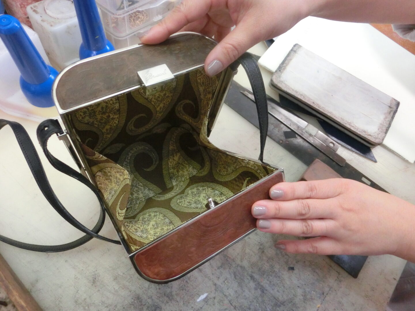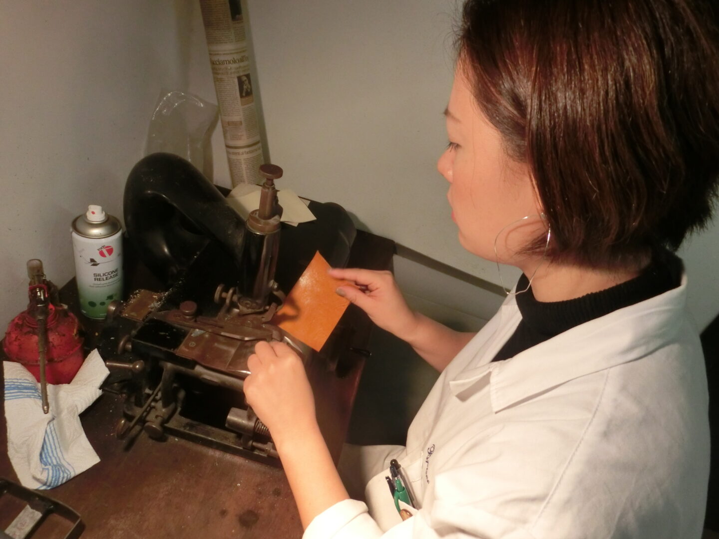 問題は後継者。残念ながら、パオロの子供たちや甥っ子姪っ子でもこの工房を引き継ぐ人はおらず・・・しかし工房閉鎖を決めて不動産として賃貸しようとしたところ、借りに来たのは日本人の革職人の女性。この女性こそ、現在のブルスコリ5代目社長の齊藤美菜子さんです。伝統工芸を残したい熱い想いで結ばれた2人は、ただの不動産の貸し手・借り手だけなく、師匠と弟子の関係になり、1年の協働期間を経て、先代と現社長となったのです。とんでもない奇跡の出会い!!