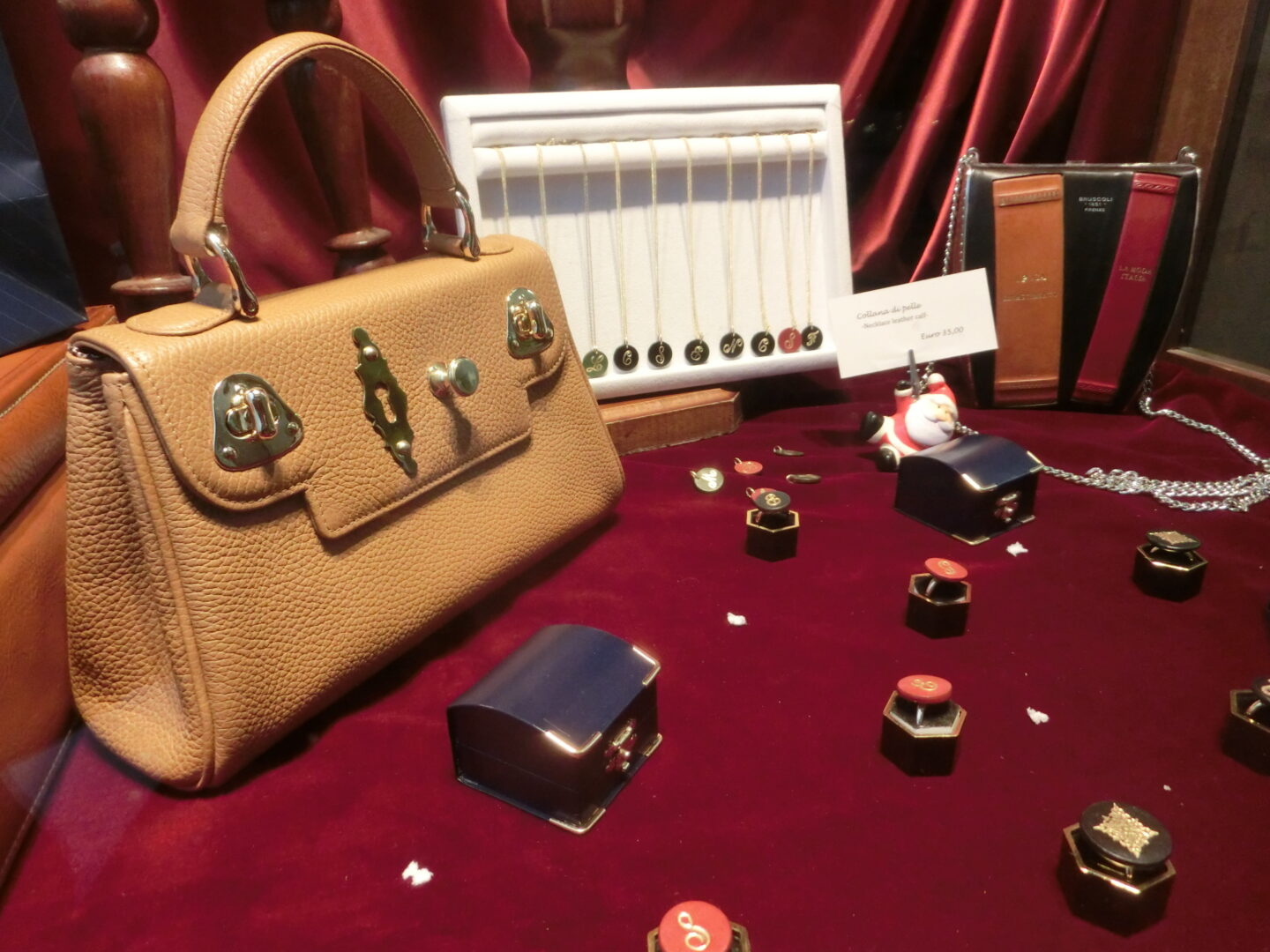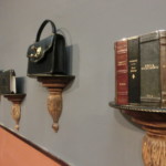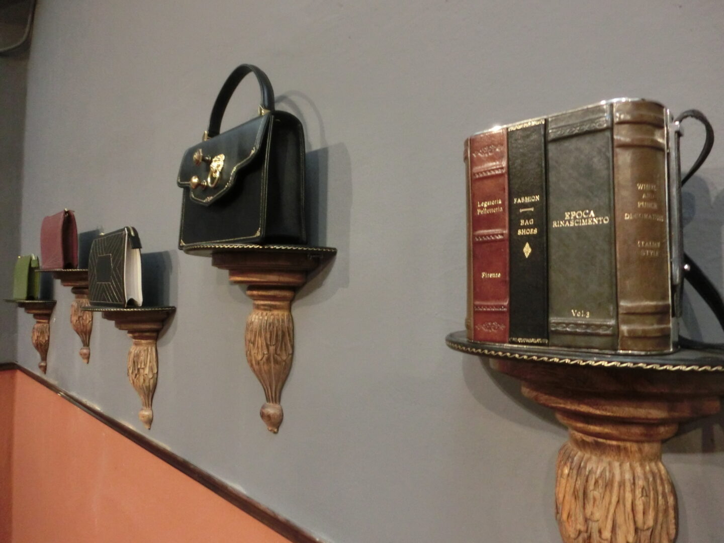 そして現在、斎藤さんは今までのブルスコリの仕事の他に、もともとの彼女の夢であり、先代までは作っていなかったバッグの製作を開始。小さなハンドバッグについているのは、フィレンツェ旧市街のドアに見られる金具で、遊び心が入ってます。そして、今この工房の顔になっているのはこちらの、「フェイクの本棚」シリーズ。