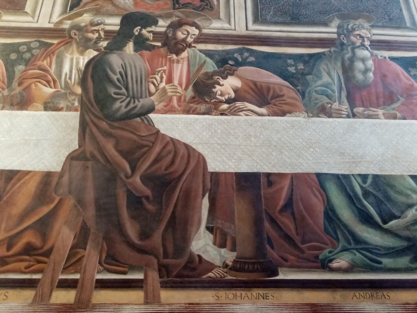 入口から食堂のドアを抜けると、いきなり「最後の晩餐」がドドドーン!と右側から迫ってきます。西側の壁のほぼ一面を使った大きなフレスコ画は、とにかく大迫力。覧のように、最後の晩餐は下半分です。ここでも観賞用のイスが並べられているので、座ってじっくり見てみるといいですよ。びっくりしたのは、この作品は描かれた当時の記録はほとんどなく、発見されアンドレア・デル・カスターニョ作と断定されたのは1800年後半。というのも、この修道院は修道女のみの施設で、修道院が閉鎖になるまでは、外部の人間は立ち入り禁止だったからだそうです。