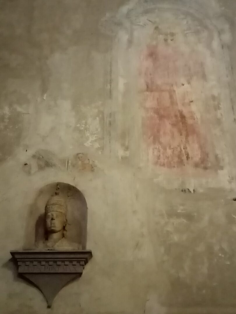 そしてサンタ・マリア・デッレ・グラツィエ教会向かって左側、付属美術館の左にあるのがサン・ロレンツォ教会。主要な美術品は先ほどの付属博物館に展示してありますが、右側の身廊にある1400年代のフレスコ画が見事です。残念ながら、剥がれ落ちている部分もあって明瞭には見えないのですが、これもその年月の重みを感じさせてくれる貴重な証拠ですね。