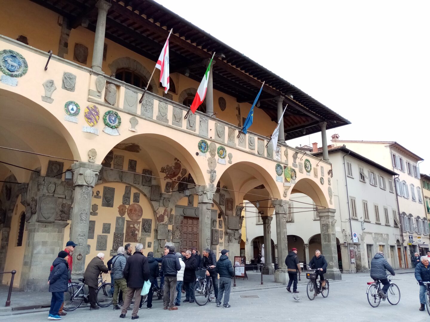 アルノルフォとは、 アルノルフォ・ディ・カンビオ で、フィレンツェのドゥオモ(ファザード)やサンタクローチェ教会、シニョーリア宮殿を設計した偉大な建築家ですが、1229年、フィレンツェ共和国の Terre nuove “新領地”となったここの都市設計 も任せられたのです。この建物は町の行政執務用に建てられたもので、正面とその裏側は4つ、側面は6つのアーチからなる柱廊から構成されています。この建物の正面(教会のある逆側)あちこちに掲げられているのは、 近隣の町や一家の紋章で、もちろんフィレンツェの百合の紋章もありました。一方、フレスコ画で書かれているのは、この町の振興に貢献したこの町の一族の家紋。彩色テラコッタは、もちろんロッビア工房の作品です。