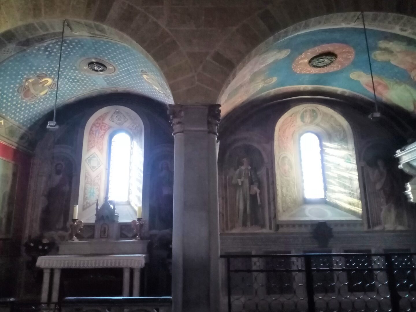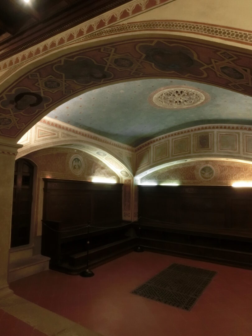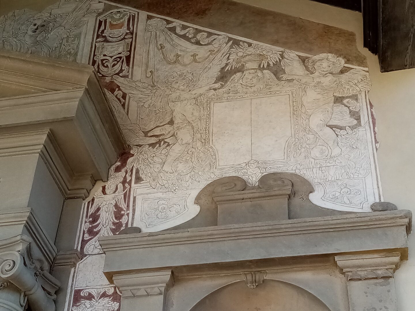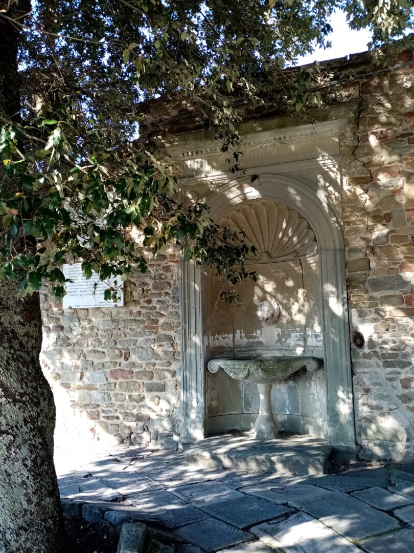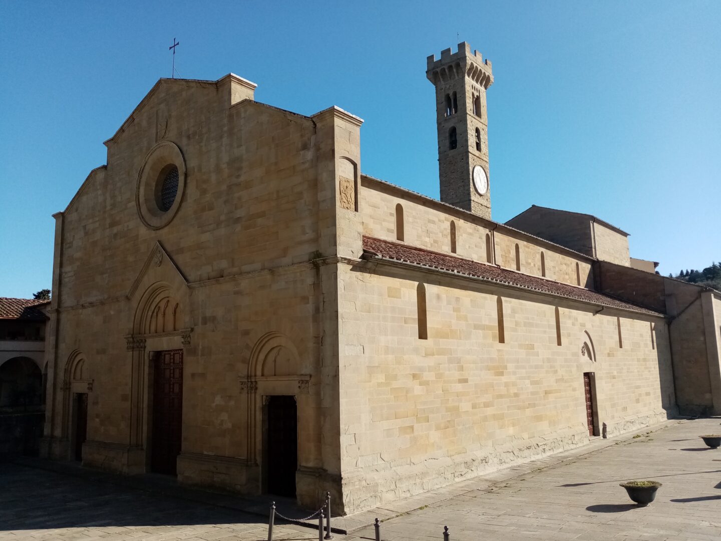 ここはフィレーゾレでも一番高い場所で、元々はエトルリア人のアクロポリスがあったところ。その後ローマ人の要塞ができますがフィレンツェ共和国によって破壊され、現在の修道院は1225年に建設された小さな修道院が起源。1390年ころから拡張し、フランチェスコ会の修道士用の修道院として活動しています。開いている時間が少ないようで、なかなか教会や奥まで入ることができませんが、教会入り口上にあるフレスコ画や、右の入り口からかわいらしい中庭を見ることができます。
