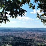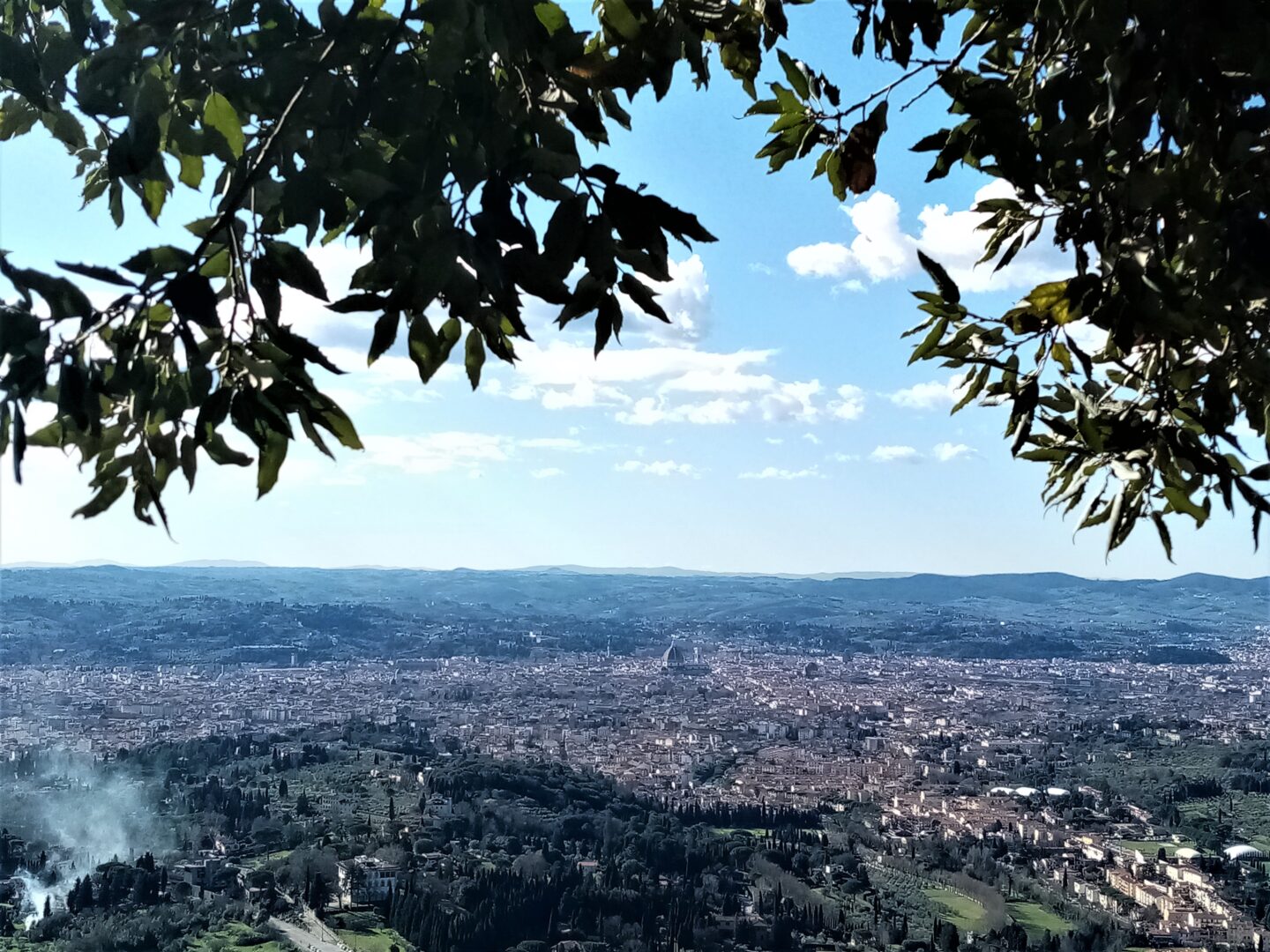 その絶景がこちら!スマホカメラ&良いお天気過ぎて綺麗には撮影できてませんが・・・真ん中より右側に、ドゥオモのクーポラと鐘楼がひときわ大きく見えるのが分かると思います。フィレンツェはドゥオモの正式名称(花の聖マリア大聖堂)から「花の都」とも呼ばれていますが、ここから見ると町全体がトスカーナの緑の大地に咲いた大輪の花のようです。
