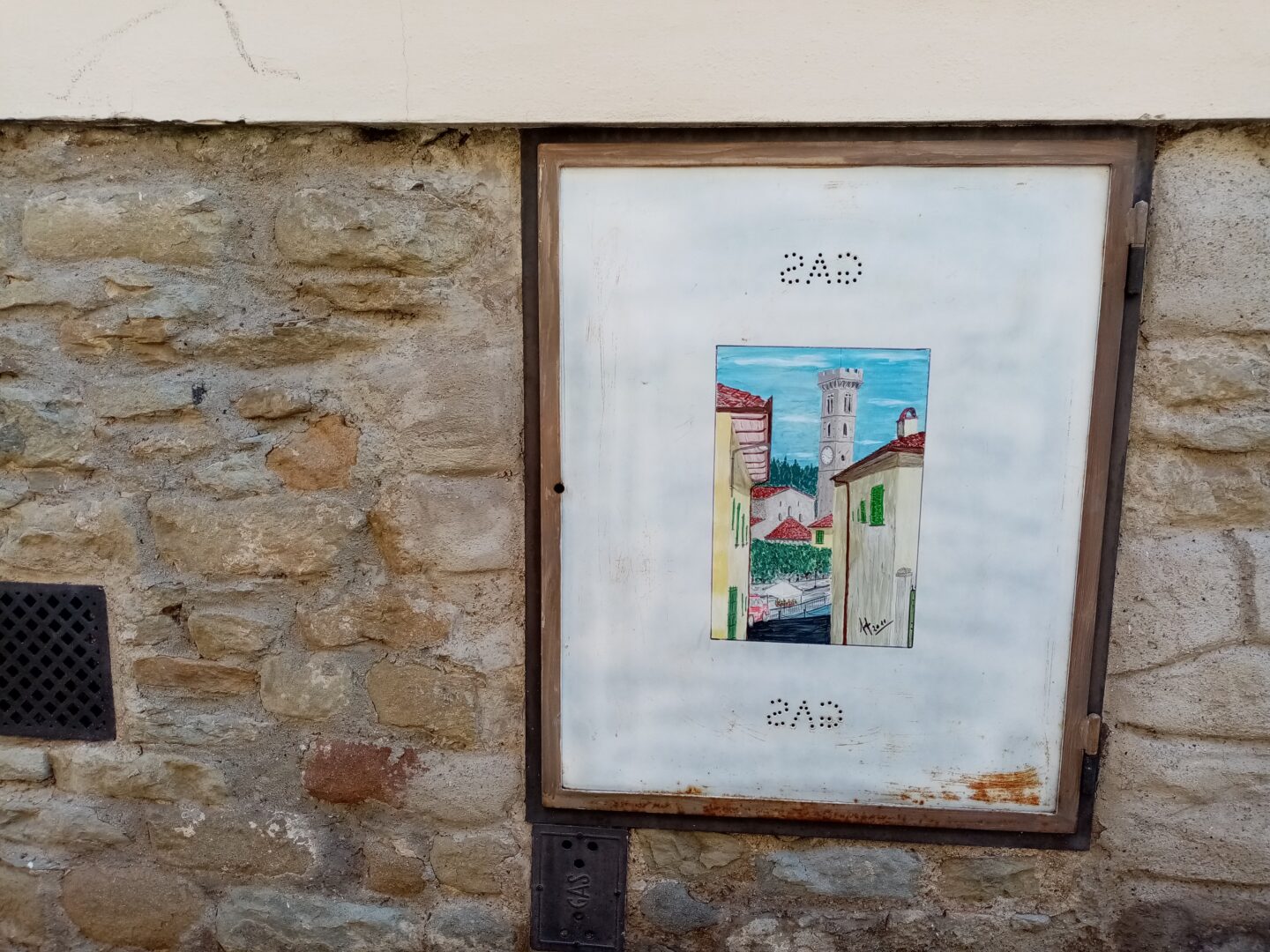 フィレーゾレ散策中、ちょっとだけ気にしていただきたいのが、ガス点検パネル!こんな風に、フィエーゾレのモニュメントや路地の絵が描かれているのです。上記の散策で私が見つけただけでも5つくらいあったかな?どれも作風が似てるので、同じ作家さんだと思われますが、ほっこりと地元愛を感じるかわいらしい絵ばかりでした。これは、最後に紹介したもう1つのパノラマポイントの壁にあったもので、まさにその道の風景(左側がフィレンツェを見下ろすパノラマポイント)となっています。