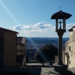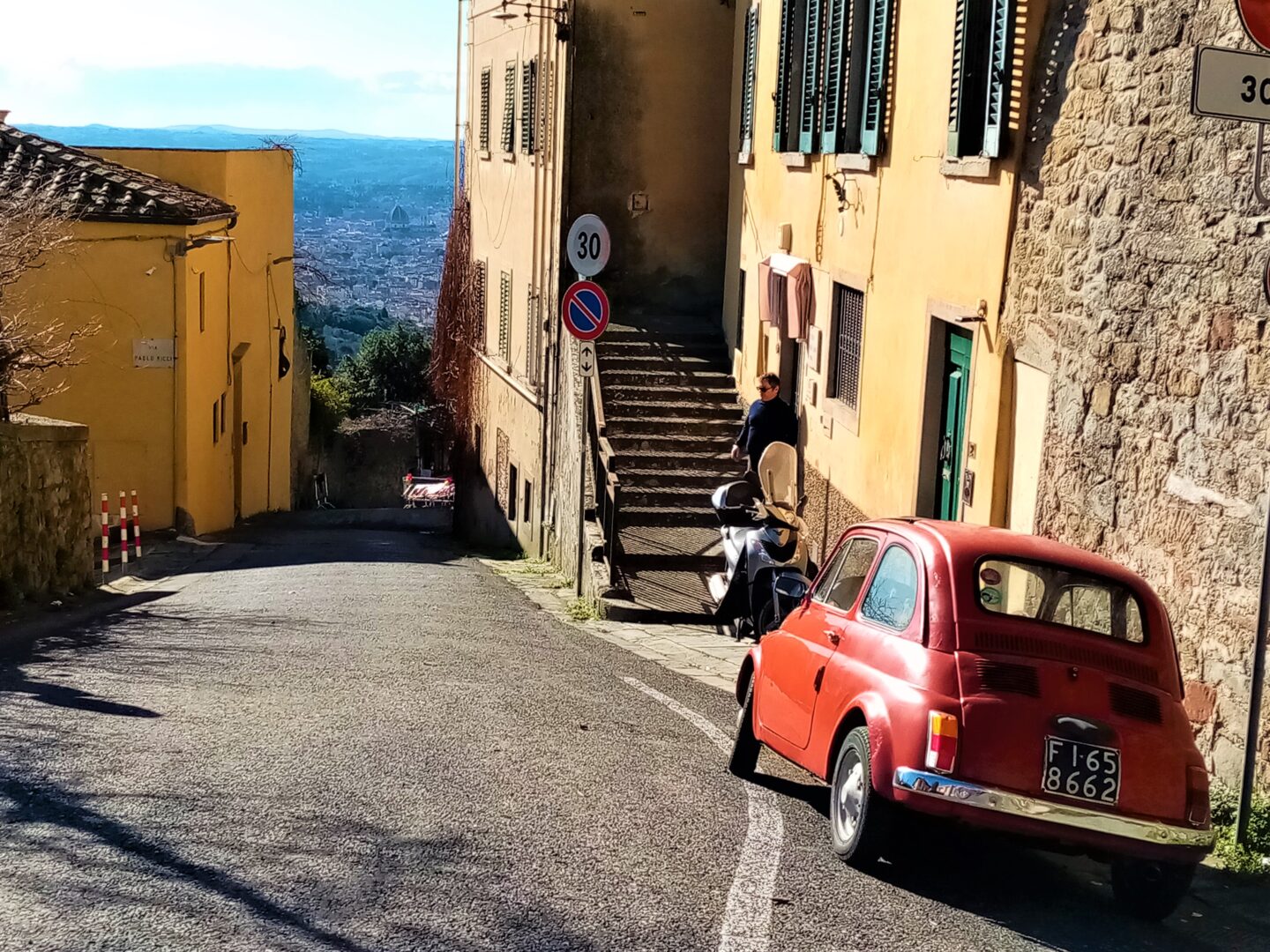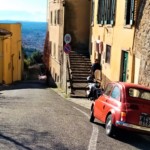 坂を上り始めて振り返ってみた、ミーノ広場。左の大きな教会がフィエーゾレのドゥオモ、奥の建物が市役所になります。坂の入り口はゆるやかですが、そこを左折すると結構急な長い坂になり、えええ!?と一瞬上るのを躊躇してしまうかも・・・それでも、ここを上れば待っている美しいパノラマを楽しみに、運動がてら上ってくださいね。