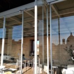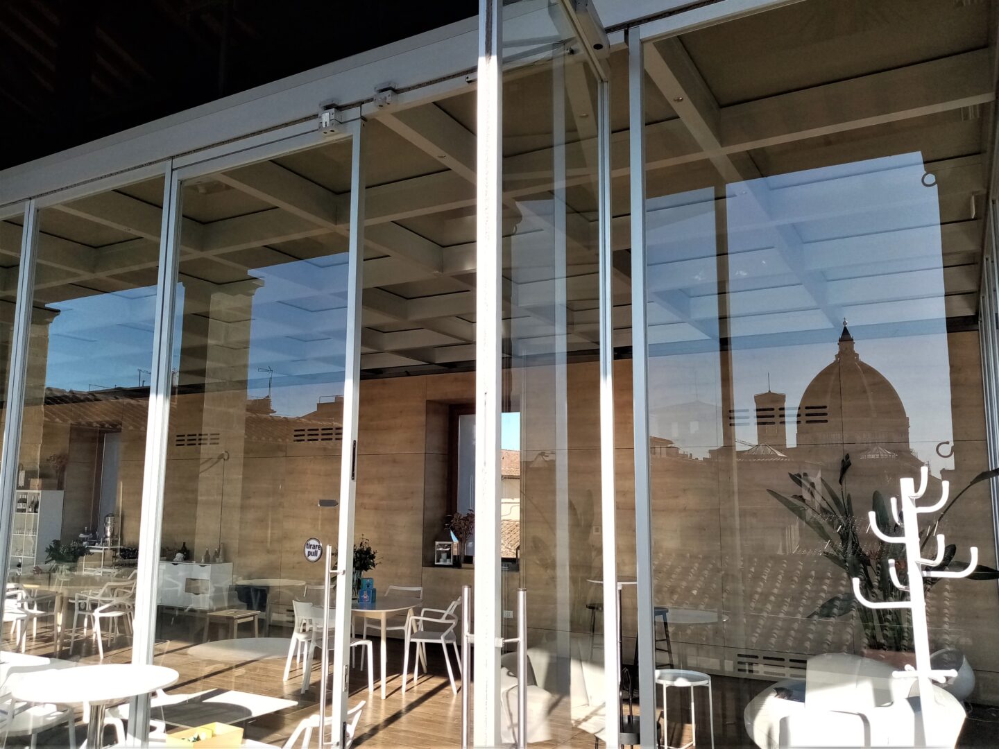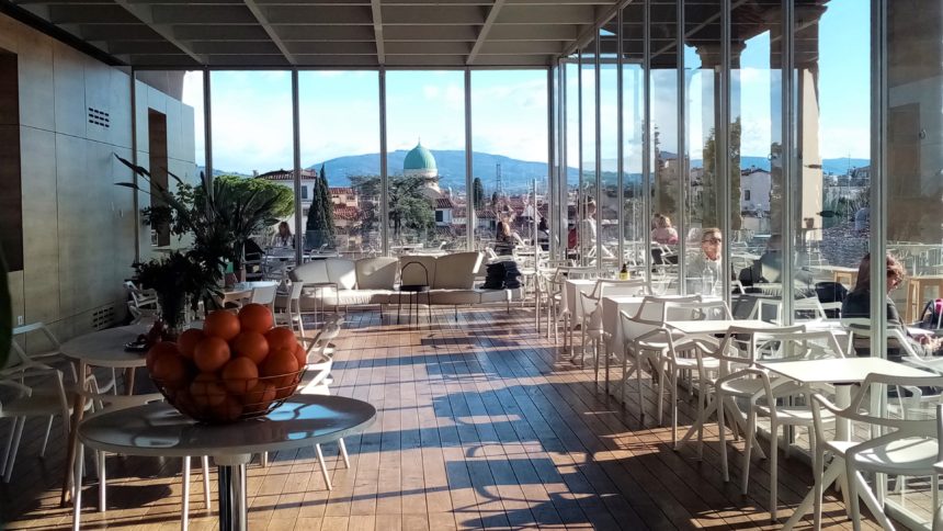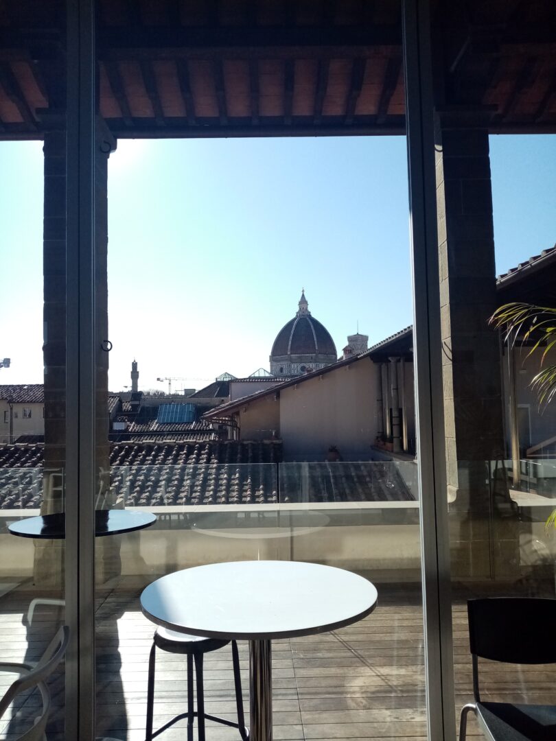 近年特に増えてきた、フィレンツェ旧市街でパノラマを見えるカフェ。おそらく一番新しいのがこのCaffe’ del Veroneで、ようやく私も行ってきました。場所はサンティッシマ・アヌンツィアータ広場にある捨て子養育院ミュージアムの最上階で、2016年6月のリニューアルの際にカフェも併設されたのです。捨て子養育院自体が600年の歴史を持ち、このカフェがあるところも1400年代から存在する場所。Verone=テラスのことで、かつては養育院の洗濯物を干していたテラスであり、1800年代に入ってからは乳母や乳飲み子、卒乳した幼児のための居間だったそうです。