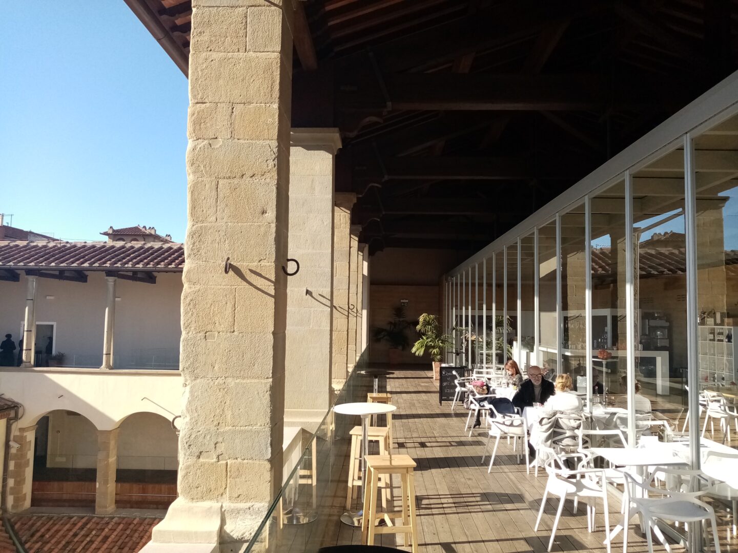 捨て子養育院ミュージアムのエントランスから左のエレベーターで直接最上階へ。ミュージアムに入らなくても、カフェ利用だけもOK。エレベーターから降りて廊下に出ると、このように捨て子養育院の中庭が見下ろせます。そして斜め向かいがお目当てのカフェ・・・もうこの時点でワクワクするようなロケーション!
